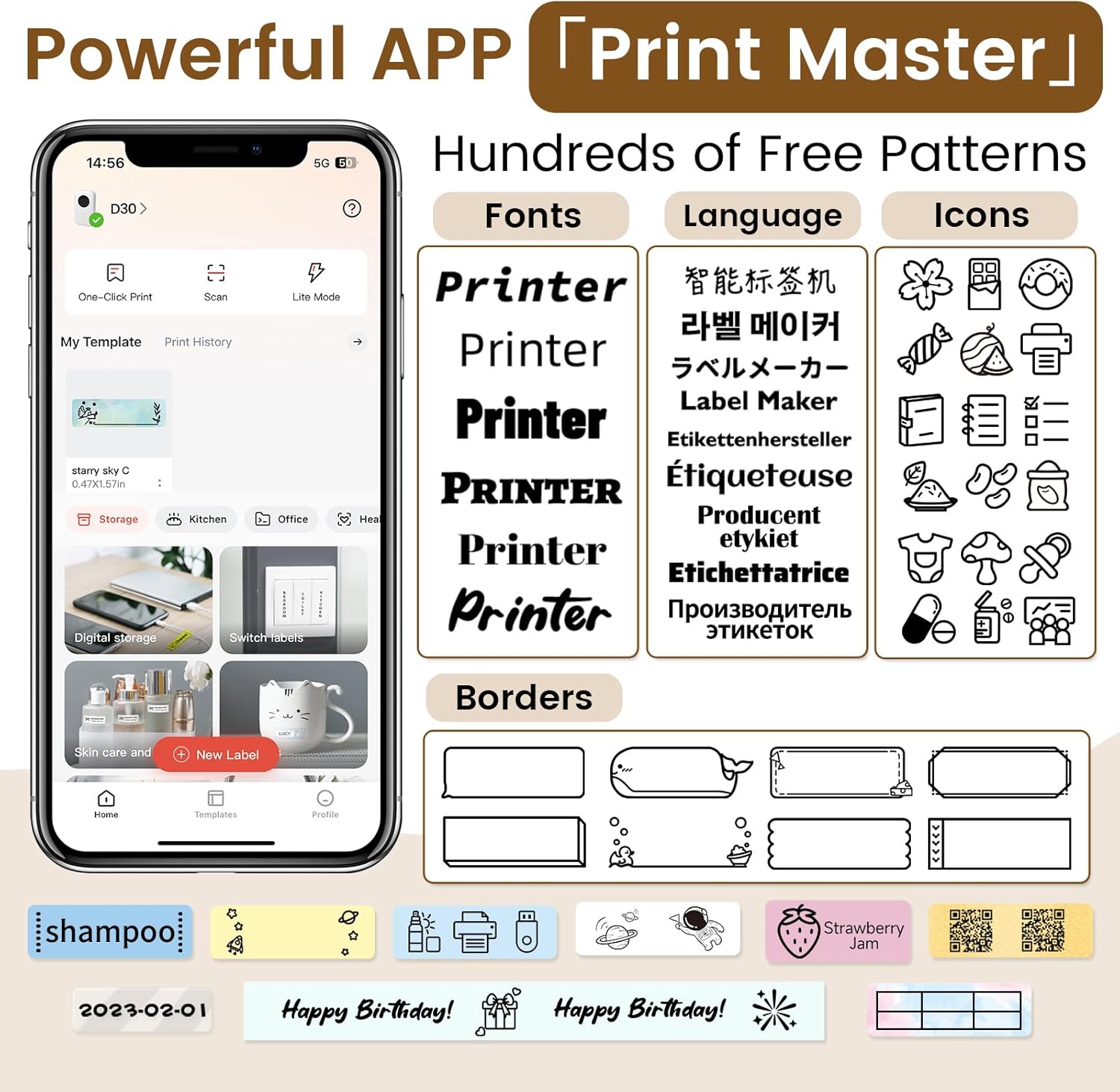 - Save Money - Direct thermal technology - The D30 Bluetooth label makers are inkless printing and don't require ink, toner, or ribbons. With lots of thermal colorful label tapes of your choice, the cost is tangible and much lower compared to most label-maker printers.(This label maker is Monochrome Printing Output, which only prints black text. We can create color-label artwork, printing with color-patterned label tapes is required)