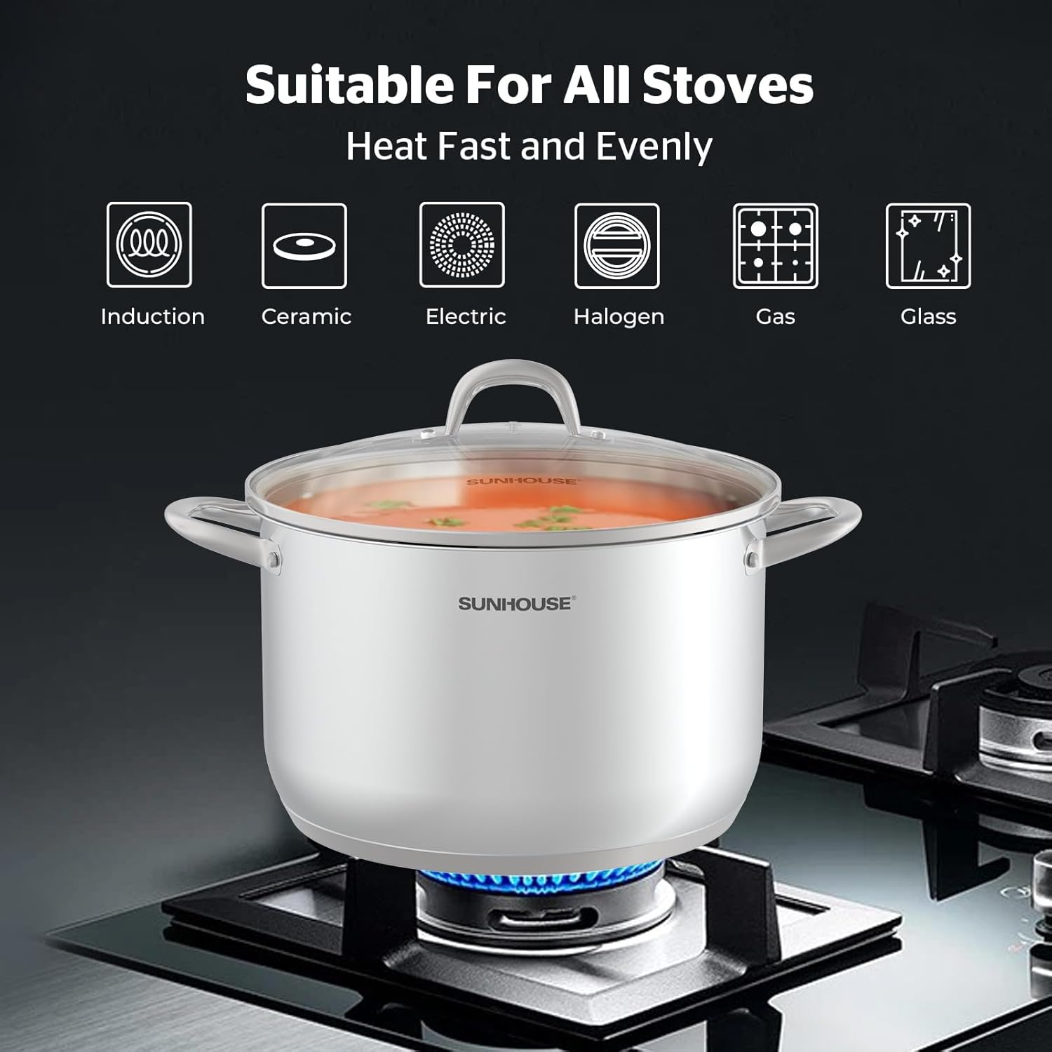 SUNHOUSE 13-Quart Stainless Steel Stockpot w/Tempered Glass Lid - Heavy-Duty, Food-Grade Cookware for Simmering, Boiling, and Induction Cooking - Exceptional Heat Distribution