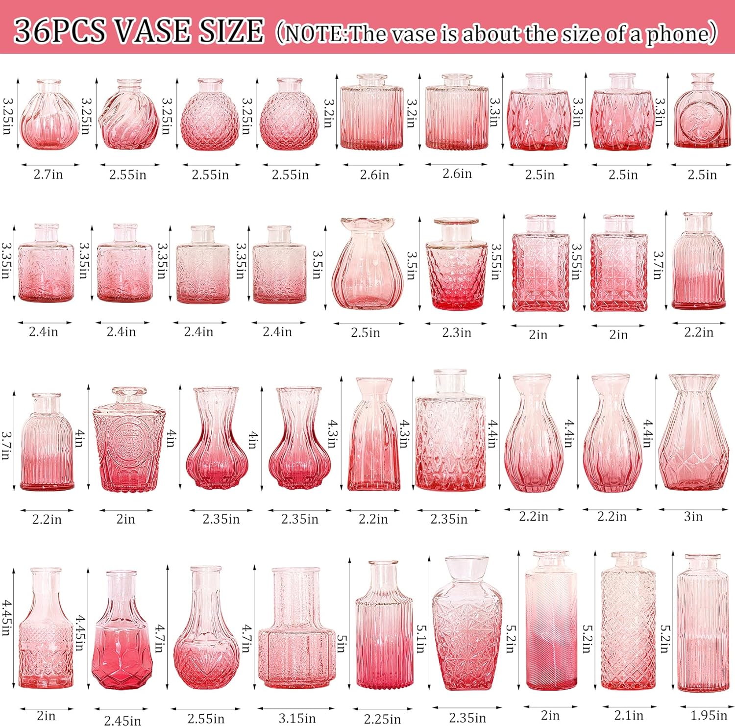 - ❤ Delicate Design: You will receive 36 adorable glass bud vases. The design of relief on the glass surface looks exquisite, beautiful, luxurious and unique. The mouth of each vase is large enough to accommodate two or three mini roses and filler flower.
