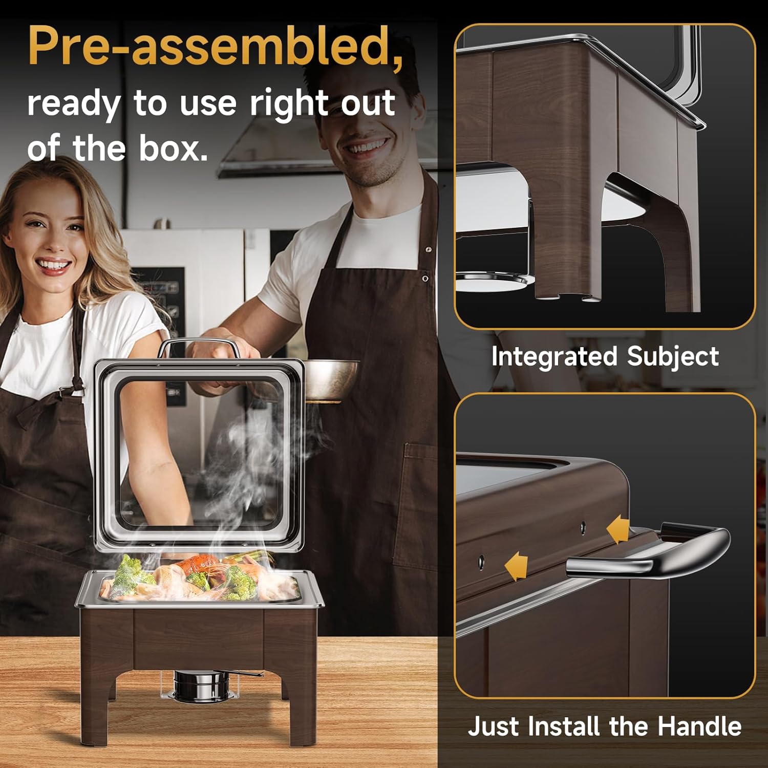 Chafing Dishes for Buffet, 6QT Square Stainless Steel Chafing Dish with Transparent Hydraulic Lid, 304 Food Pan, Buffet Warmer for Parties and Events (Wood Color)