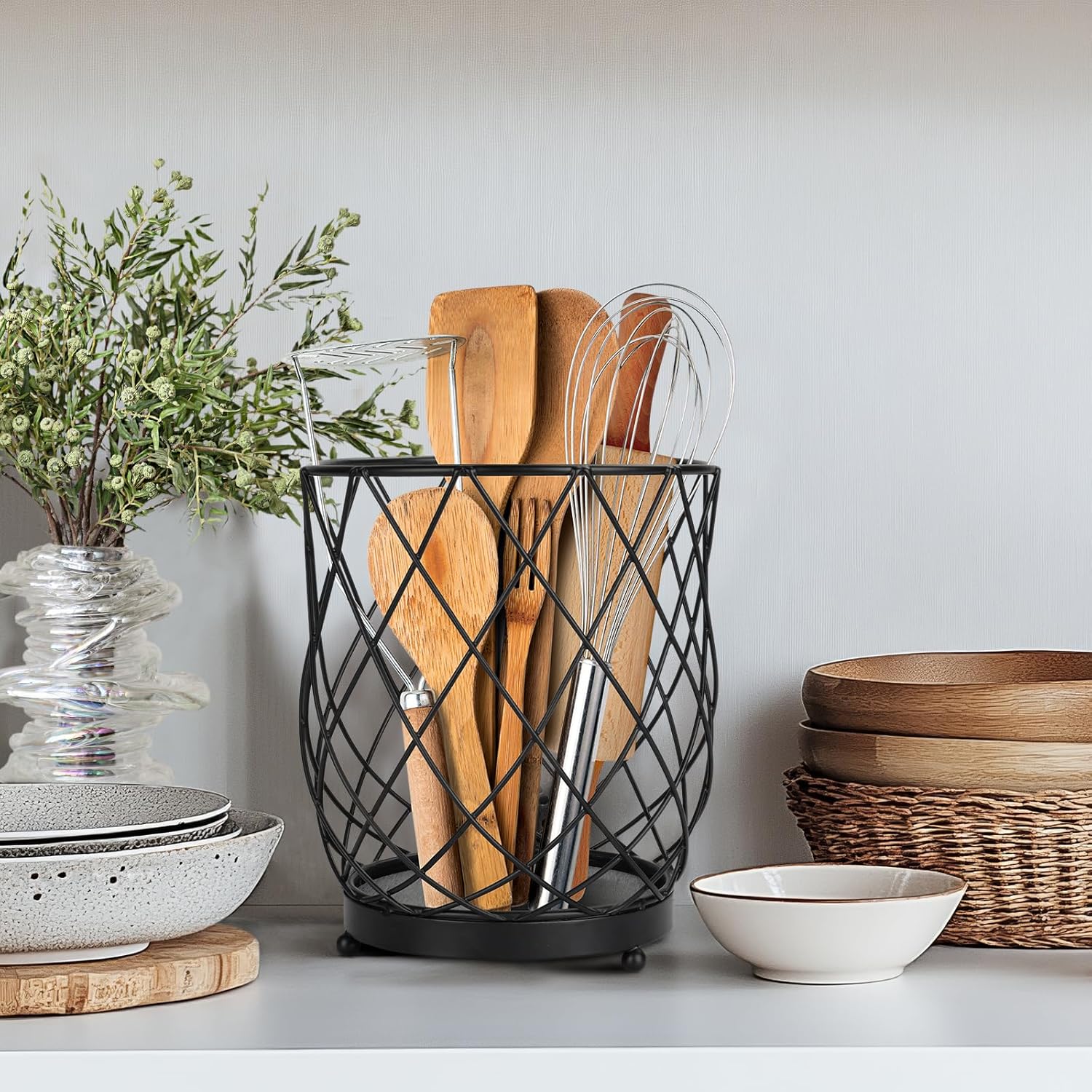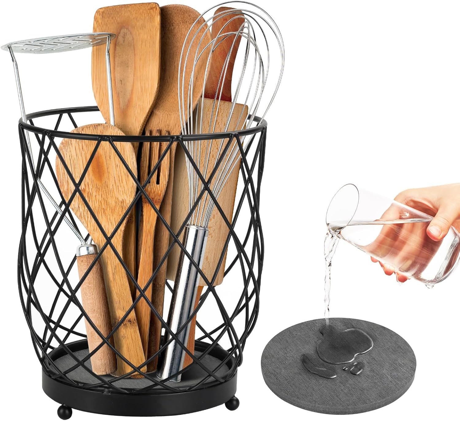 - Classic Kitchen Utensil: The kitchen utensil holder is made of metal and equipped with Diatomaceous Earth Base. the utensil holder is both sturdy and resistant to deformation. The stylish metal mesh edge complements any kitchen decor, adding a modern and elegant touch to your space