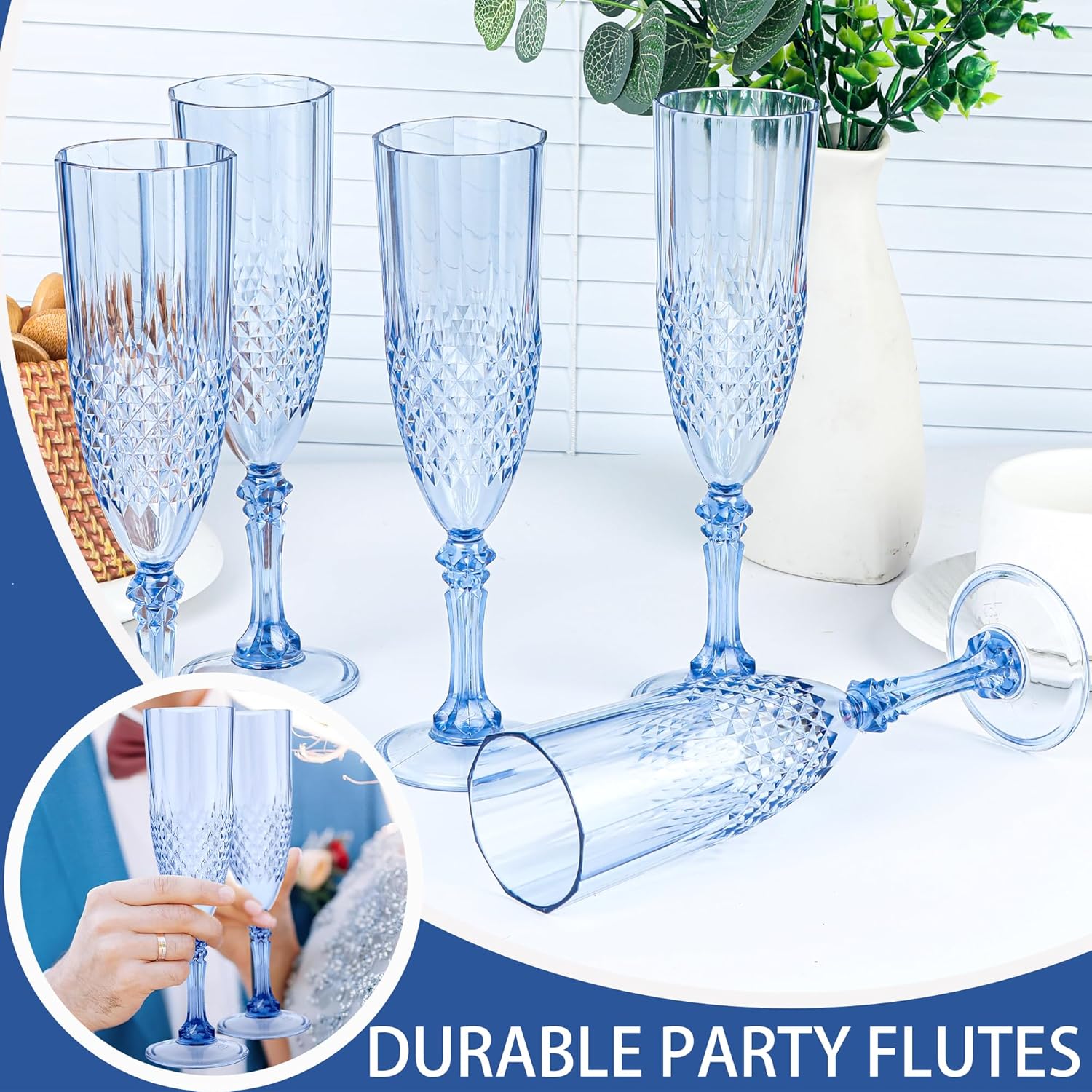 - Charming Set: Champagne flutes set include 24 retro-style blue champagne plastic wine glasses, providing ample quantity to meet your daily use and replacement needs. A suitable champagne cup is the icing on the cake. Plastic wine glasses not only carry the wine, but also carries the laughter and blessings