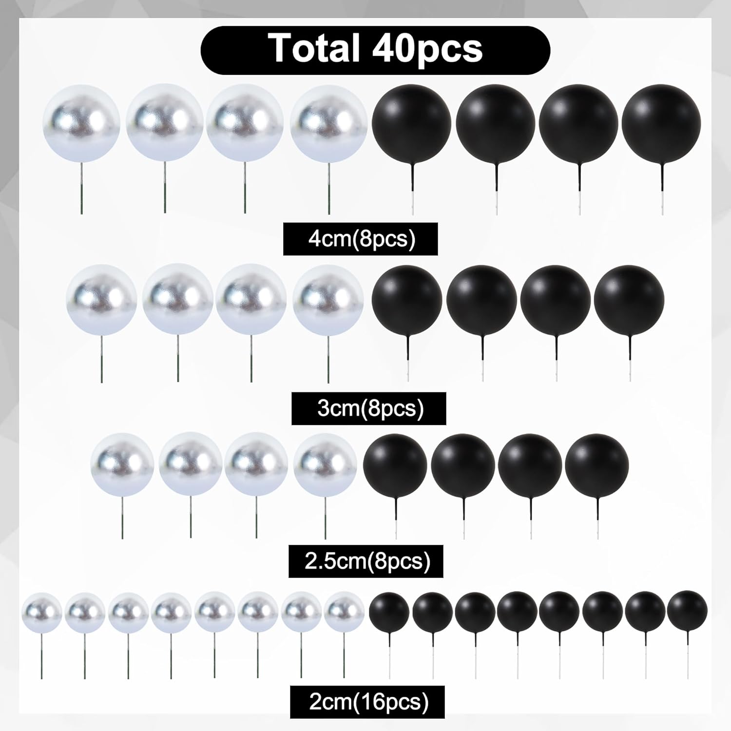 BEISHIDA 40 Pcs Ball Cake Toppers Mini Balls Cake Decorations Black Silver Foam Balls Sticks DIY Cake Topper for Baking Congrats Grade 2025 Graduation Birthday Retirement(Black Silver)