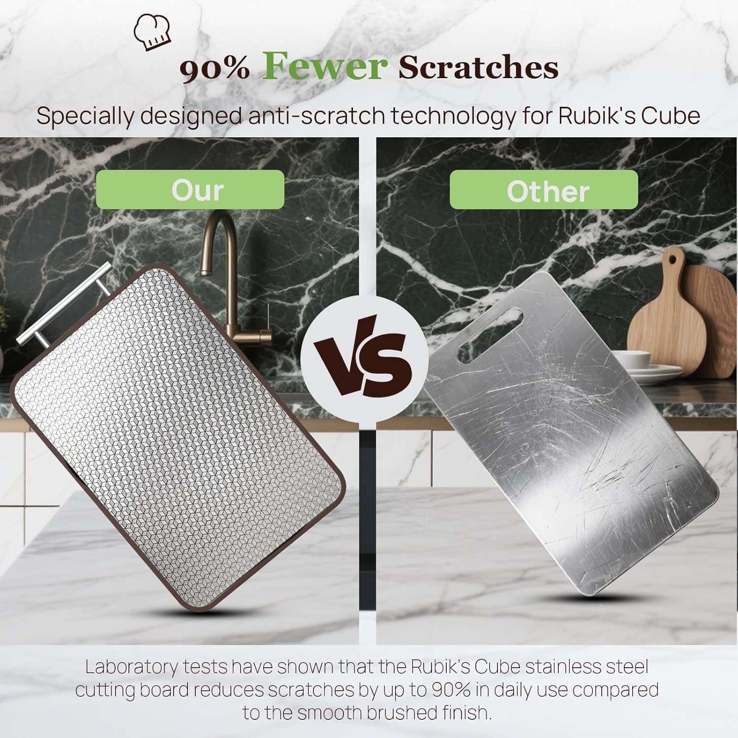 - Premium Dual-Surface Design: Upgrade your kitchen with LABETA's 2 in 1 cutting board! The Rubik's Cube-inspired stainless steel side features a textured grid to cut raw meat while reducing surface scratches by 90%. The reverse smooth ebony hardwood side is perfect for chopping vegetables and fruits, cooked foods, and steak. Effectively separate raw food from ready-to-eat food. (Note: Natural wood board, ~4 lbs – handle with care)