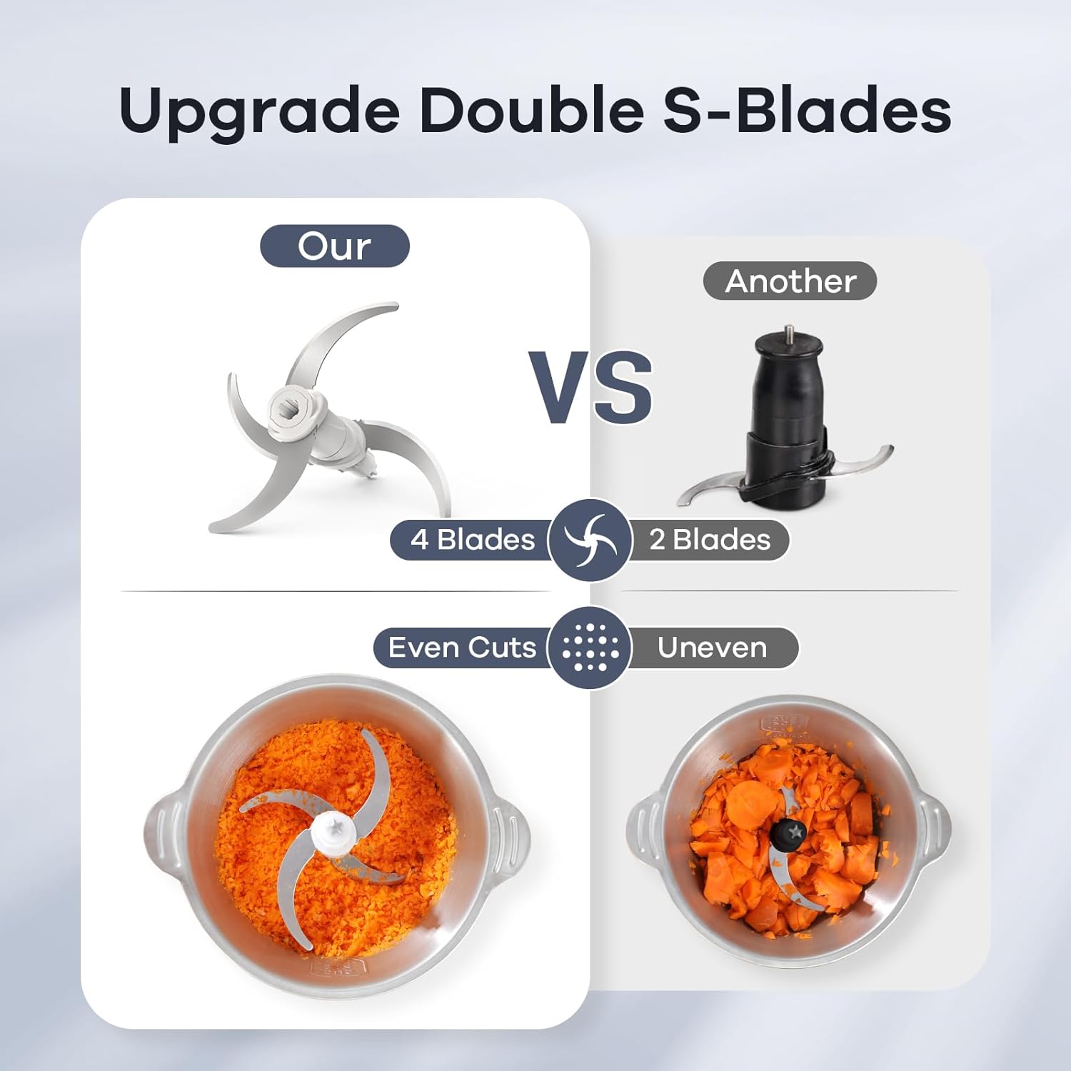 - 【2 Speed - Great Time Saver】Powerful copper motor certified for professional use combined with upgraded two levels of "S" stainless steel blades, a few seconds is enough to turn any vegetable or meat into tiny bits. 2 cutting speeds to meet different needs of foods or texture.