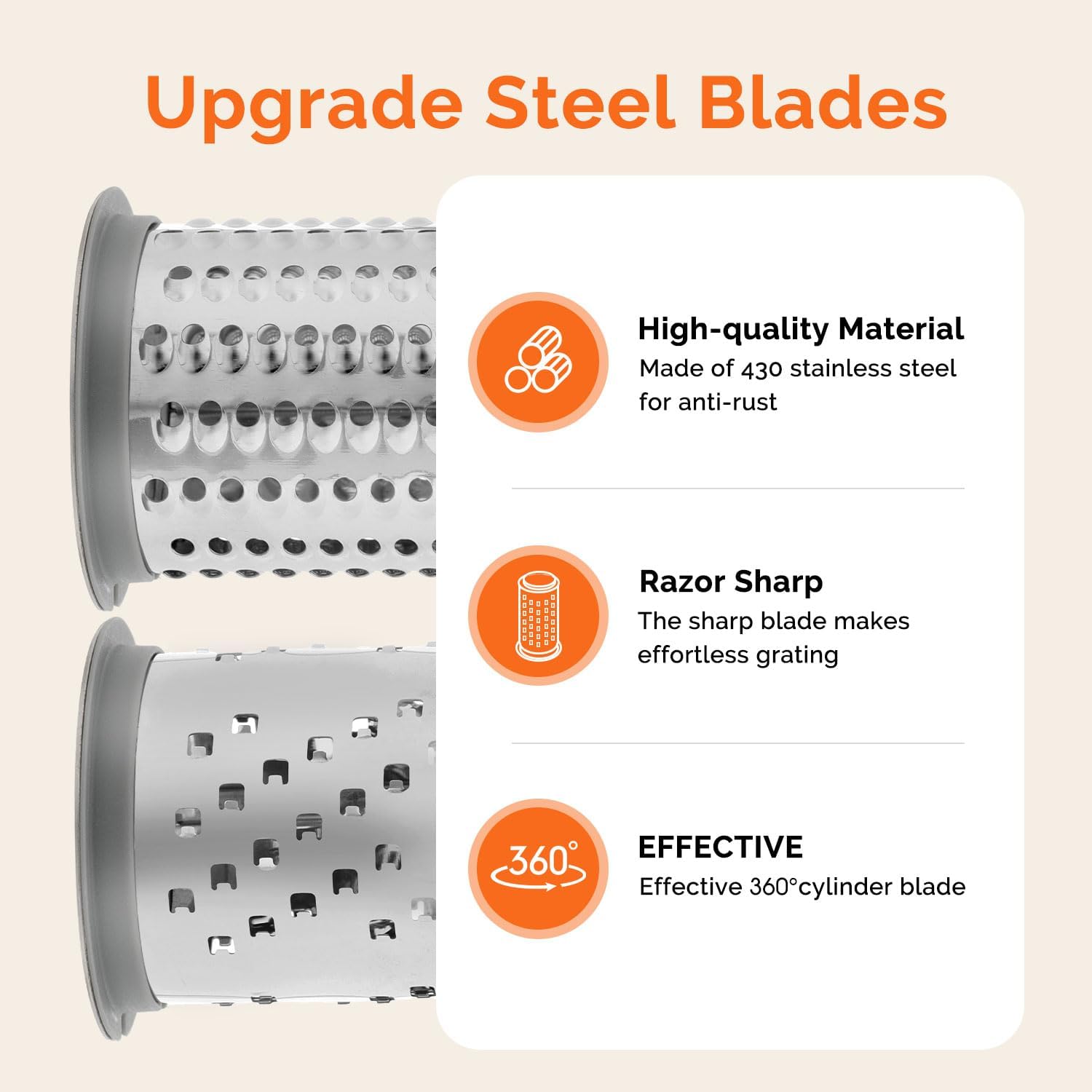 - Easy to Clean - The cheese grater’s drums are easily removable for quick cleaning, and dishwasher safe ensuring a hassle-free experience every time you use it