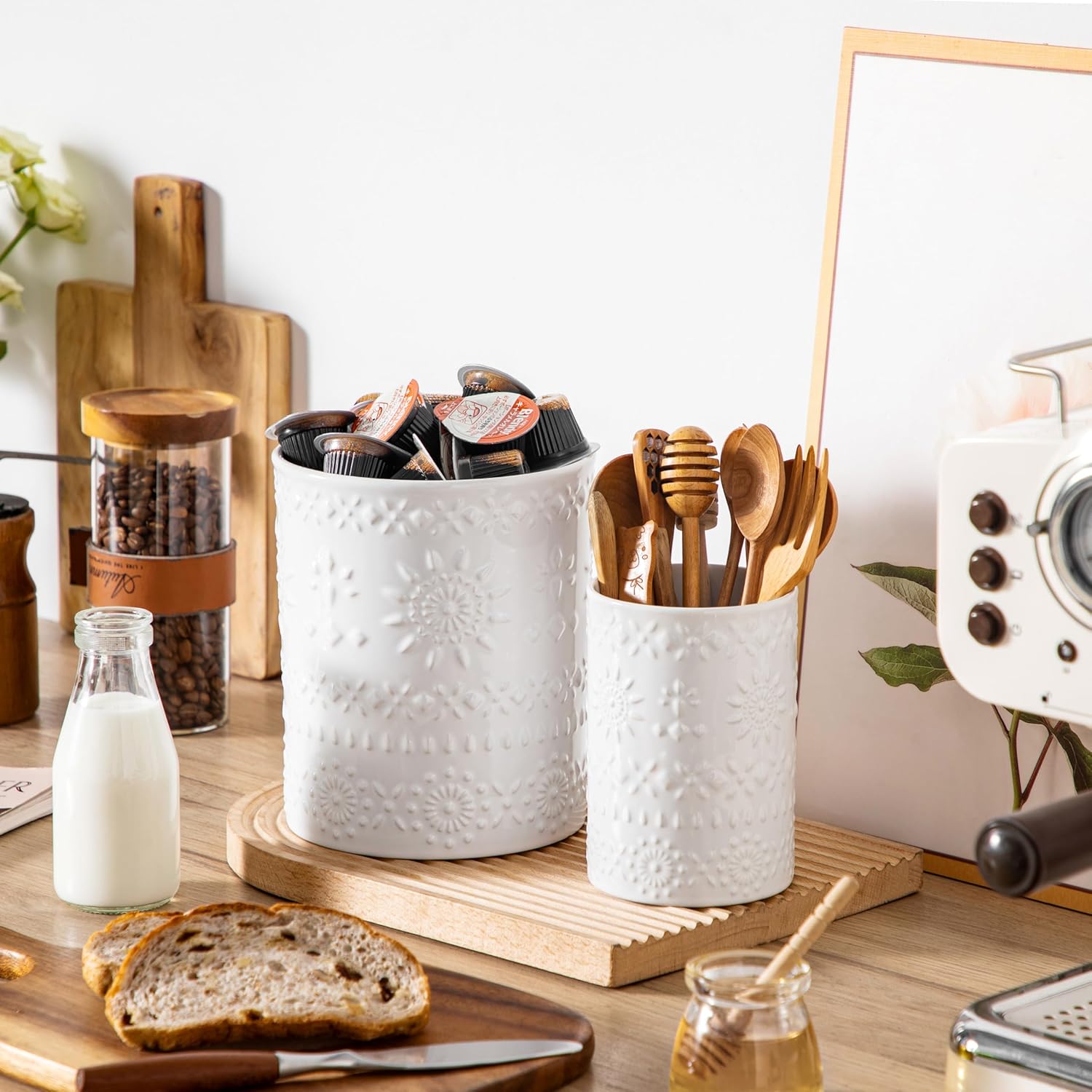 LOVECASA Utensil Holder, 7.2"+5.4" Ceramic Utensil Holder for Countertop, Large Cooking Utensil Crocks for Kitchen Counter, Farmhouse Utensil Vase for Housewarming, Kitchen Decor, Set of 2, Snow