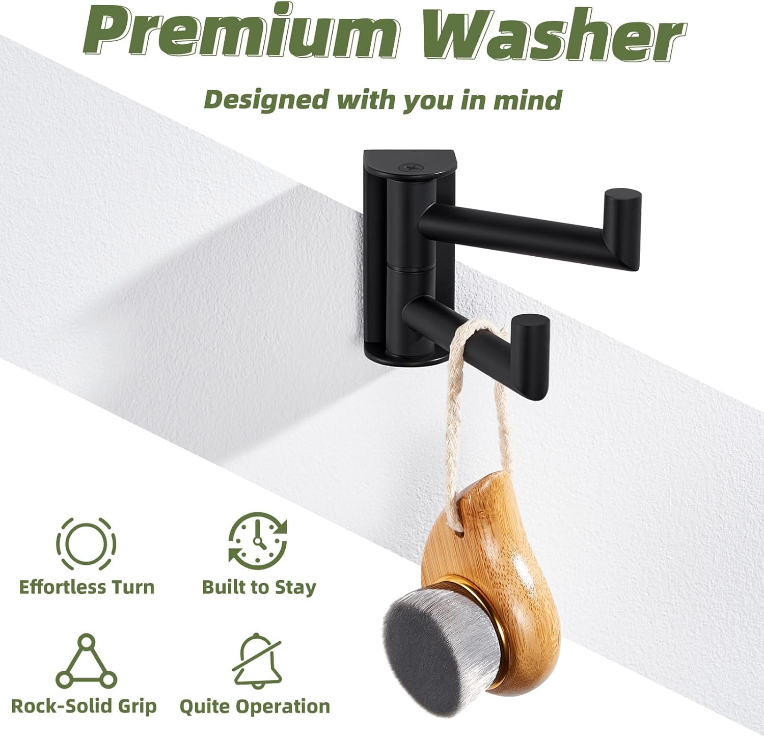 - ENHANCED STABILITY: the towel holder has plastic washer at the pivot points, bringing advantages like smooth rotation, quiet operation, and a firm grip without loosening. Carefully designed details makes our black towel hook sturdy and reliable