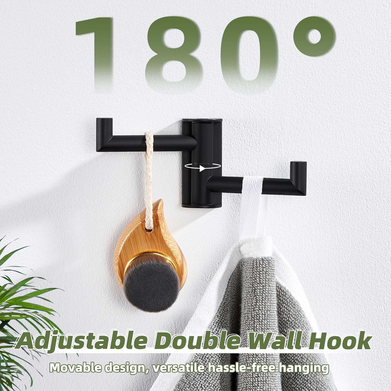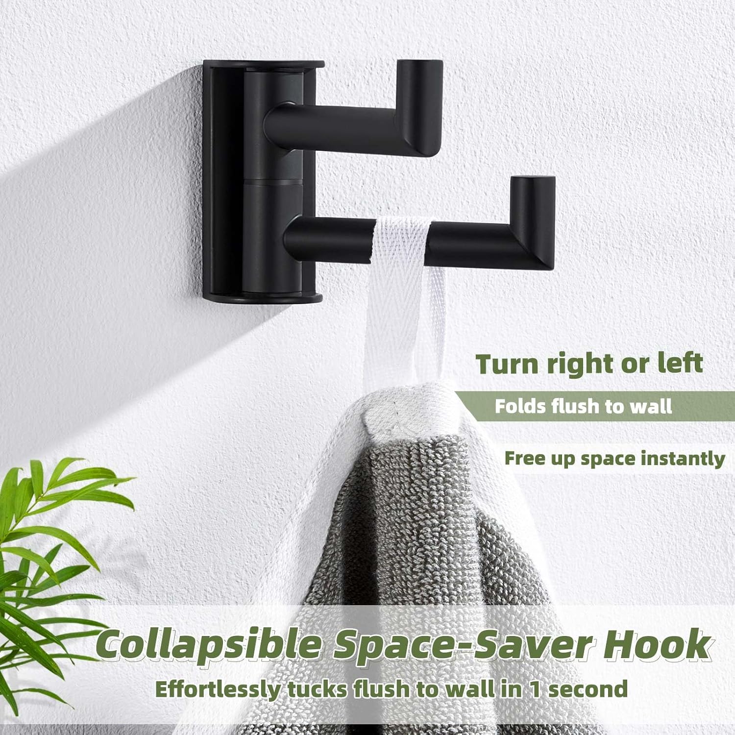 APLusee Swivel Towel Hook 2 Arms Matte Black, 304 Stainless Steel Bathroom Double Towel Holder, Folding Robe Hook Wall Mounted