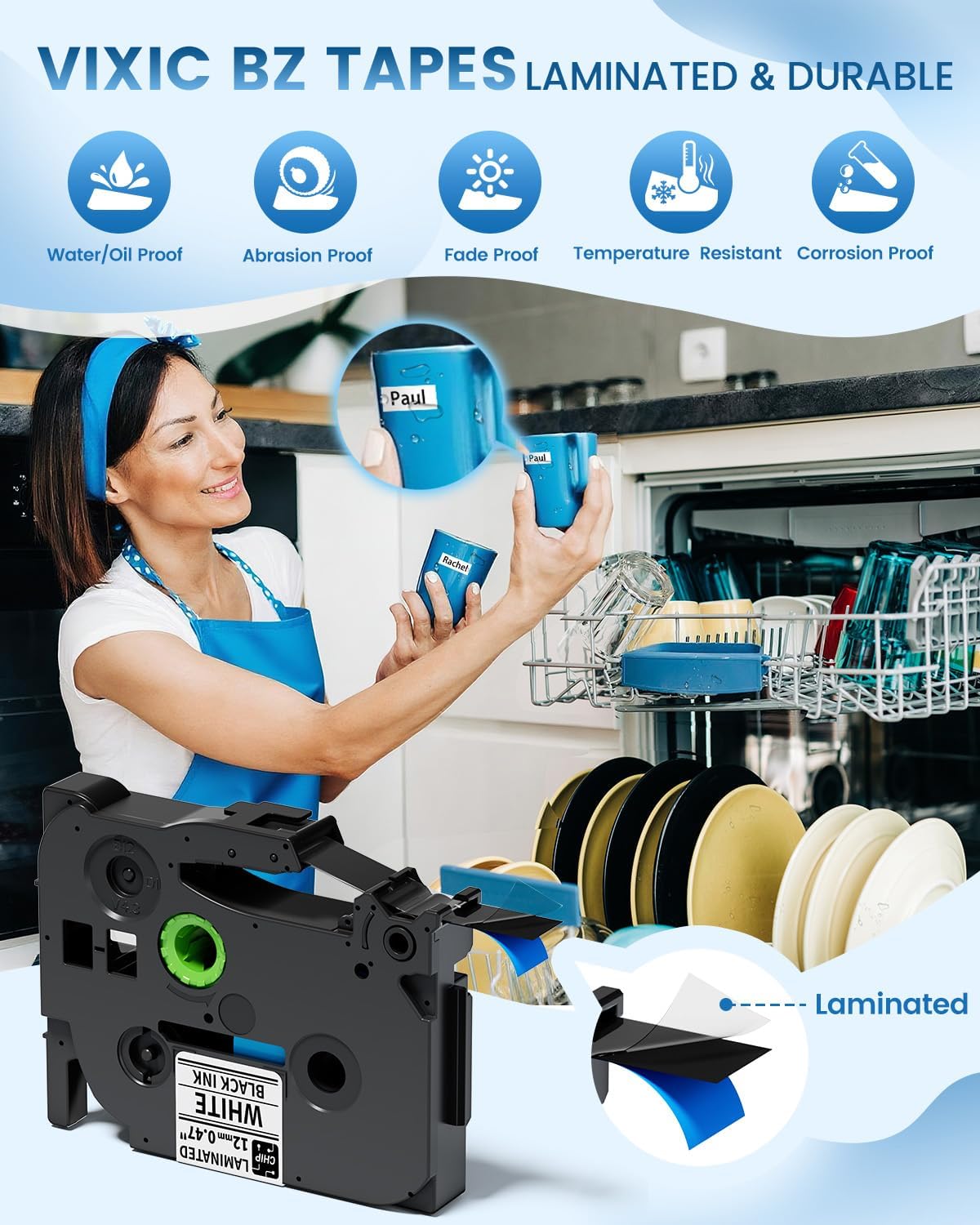 - VIXIC BZ LAMINATED TAPES: As premium label maker waterproof labels, standard BZ tapes are extremely strong and durable thanks to their 7-layer lamination technology. They stay put both indoors and outdoors, and withstand extreme conditions — including water, extreme temperatures, oil, abrasion, and UV fading — even through transitions from freezer storage to microwave heating to dishwasher cleaning in the kitchen