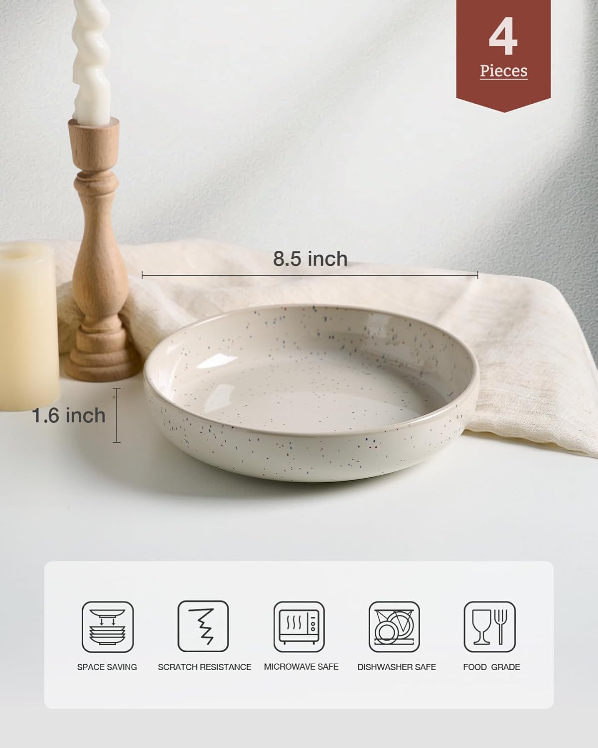 - PASTA BOWL SET OF 4 - Ideal size 8.5’’ Dia, practical depth 1.6’’ H, It holds contents both solid & liquid with ease- great for pasta, soup, dessert, ice cream, rice, beans and so on