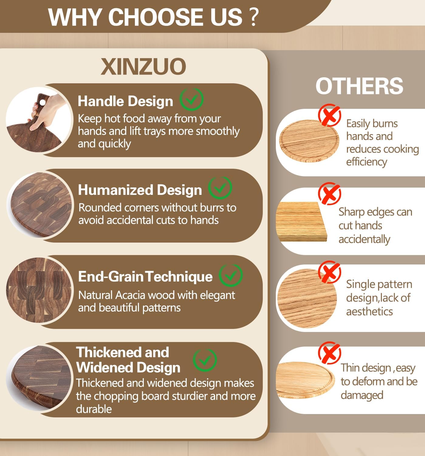 XINZUO Acacia Wood End-Grain Round Cutting Board with Handle for Kitchen Bread Pizza Cheese Fruit Charcuterie Serving Cutting Board, Two-sided Use, 16.7 x 12.5 x 0.75 inches