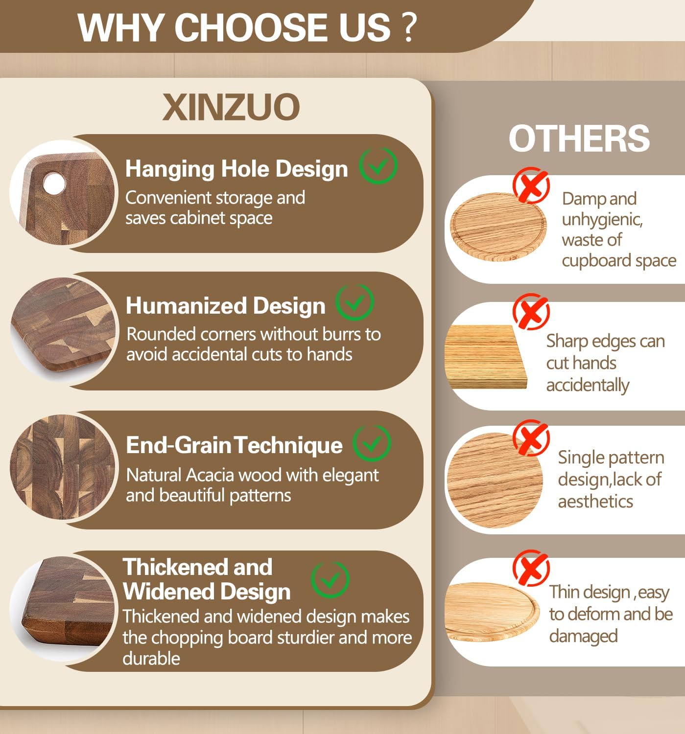 - Knife-Friendly Design - Our cutting boards are made with a end-grain seamless stitching process, where the wood fibers rebound and repair themselves after being cut, acting as a blade protector. End grain cutting boards have a unique “self-healing” ability, where the wood fibers close and repair themselves after each cut, thus reducing the appearance of knife marks and keeping the board as new for a long time.