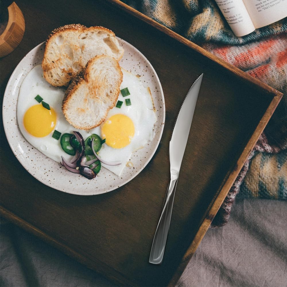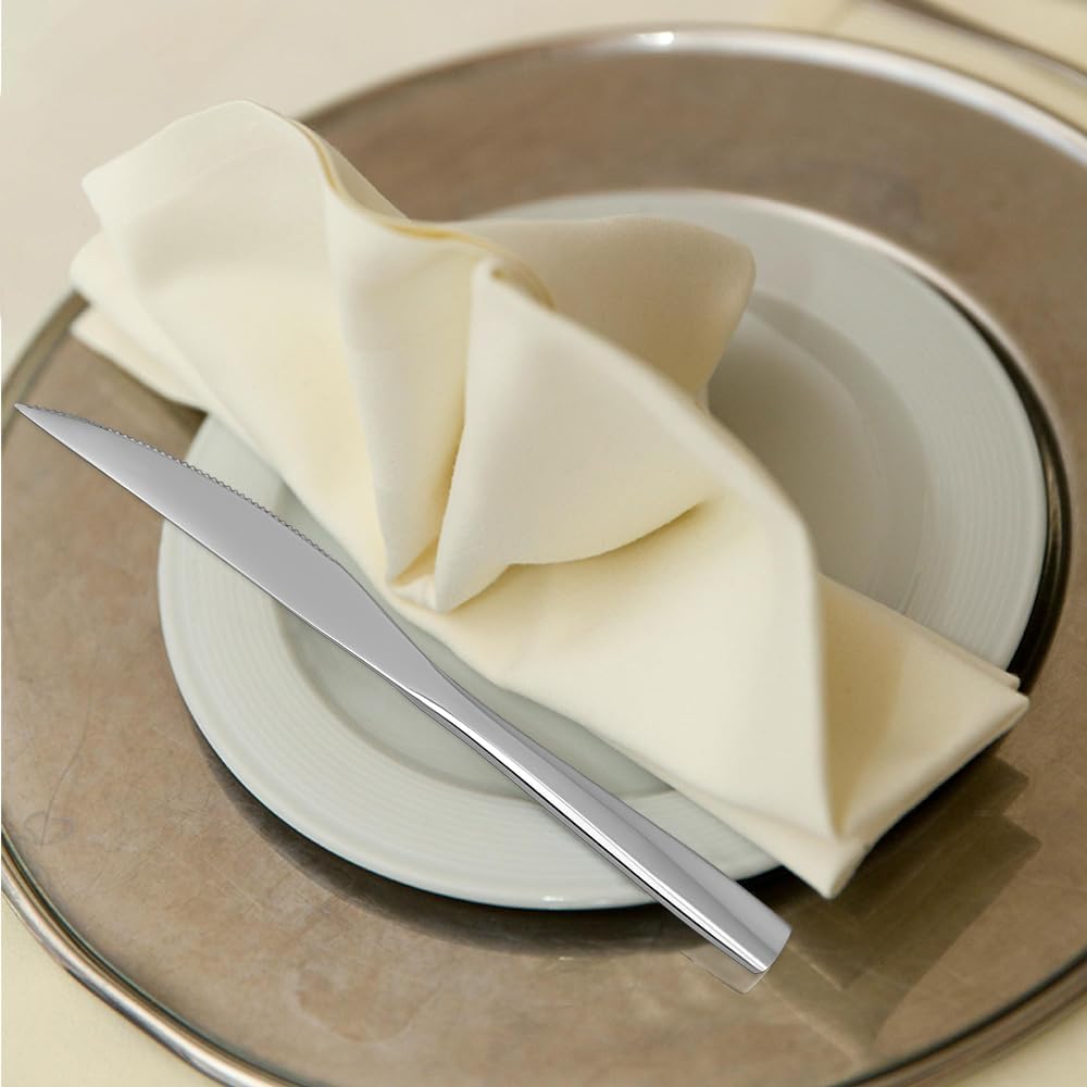 - HIGH QUALITY : SANTUO Direct 12-piece Steel Steak Knives Set are made of top food grade stainless steel. seamlessly add more elegance and class to your table. mirror polish makes these modern silverware always keep shining, They are resistant to rust, corrosion and are dishwasher safe.
