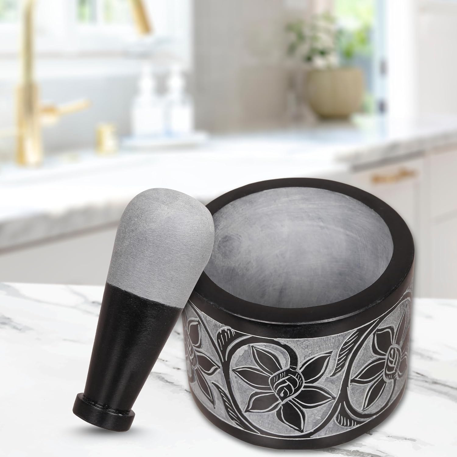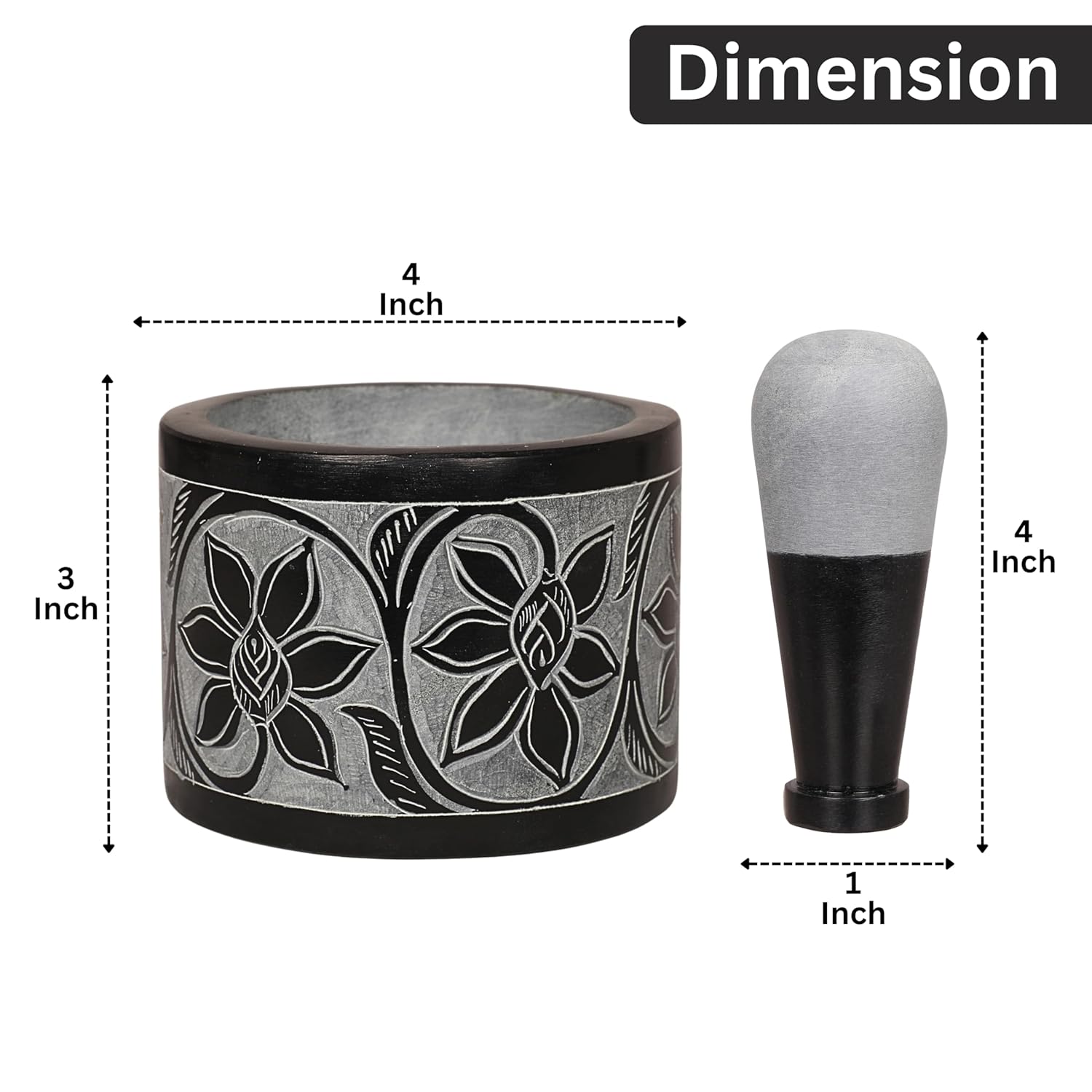 - CLASSIC DESIGNING: The outer polished surface engraving makes it look trendy and exotic when placed on the shelf of your kitchen. The inner part of the mortar is rough that provides an excellent surface for dry and wet mixing. The pestle is made in such a manner that it makes full contact with all the ingredients and bring out the hidden flavors that are usually missed with machine- grinding. It comes with a broad and narrow end, both of which can be used depending on the purpose.