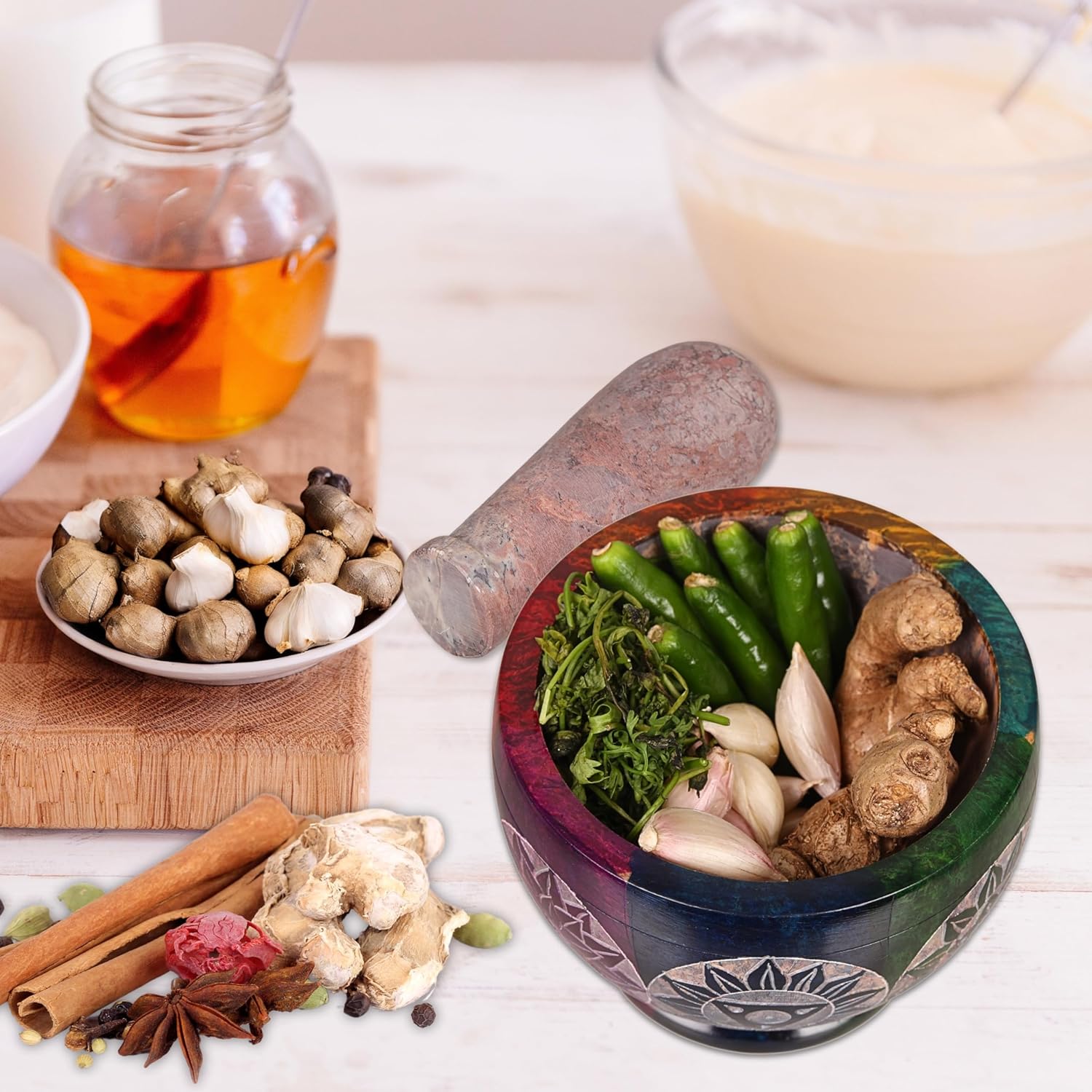 Mortar and Pestle, Made of Heavy Duty Polished Hard Stone, Natural Stone Grinder for Spices, Pastes, Herbs, Seasoning etc. (Rainbow)