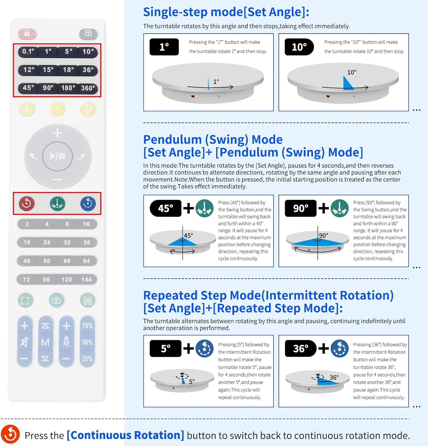 - 【This Large Turntable includes a Professional Flagship Remote Controller】:Precise angle settings and user-friendly combination key design enable support for a wider range of applications. Support: Set the current position as the origin point (used in conjunction with the "Return to Origin" button). Support: Save the current settings to the turntable's internal flash. More versatile angle buttons and mode button combinations provide greater flexibility for various applications