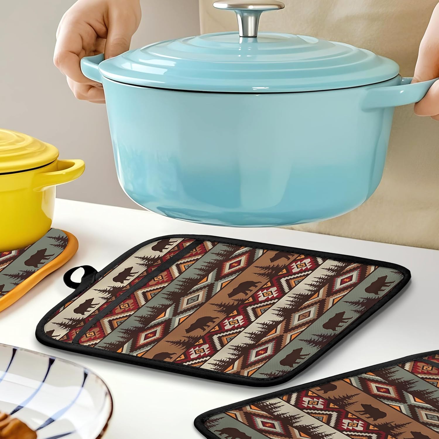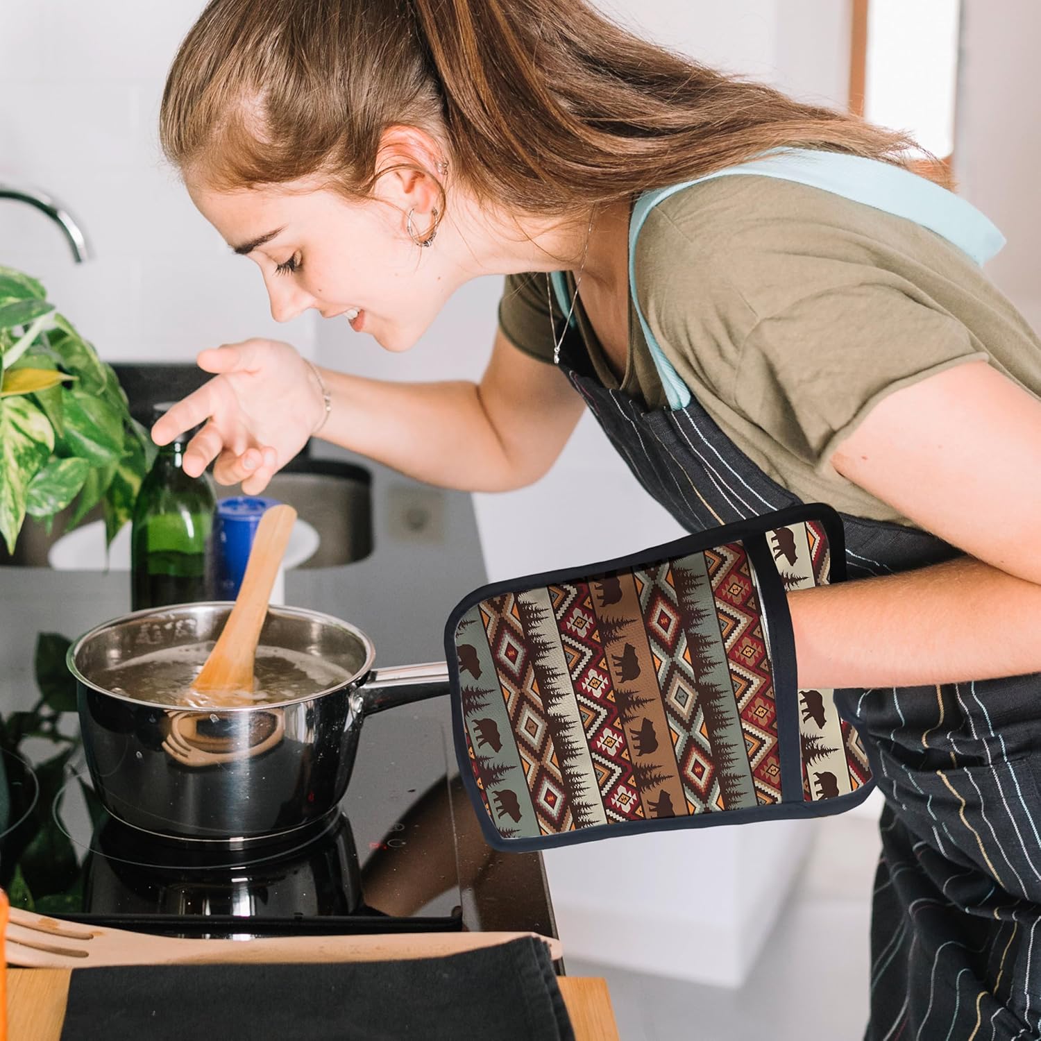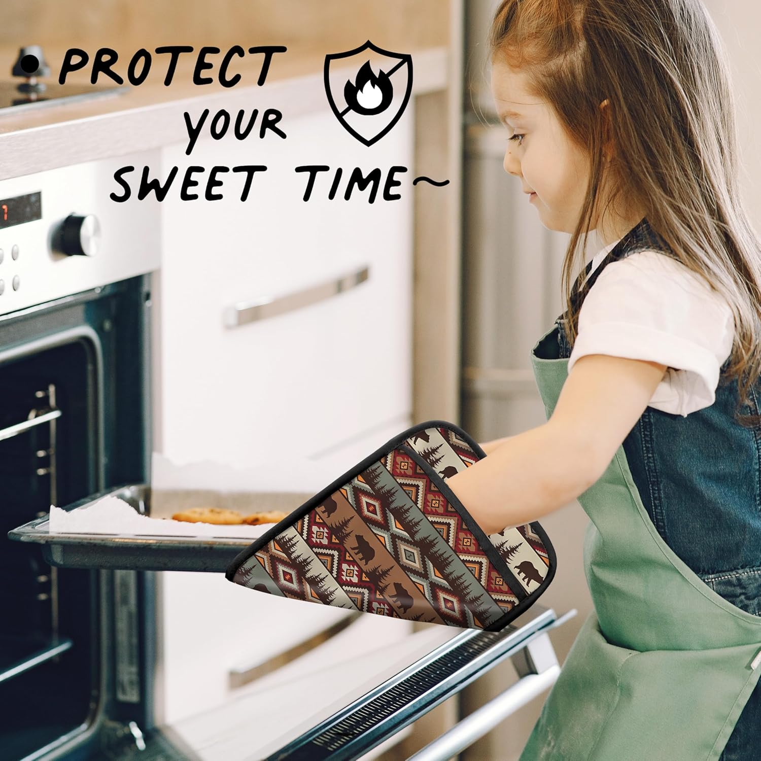Western Aztec Bear Oven Mitts Set, Camping Camper RV Gifts, Aztec Native Tribal Heat Resistant Kitchen Oven Gloves for Baking and Cooking,Pot Holders