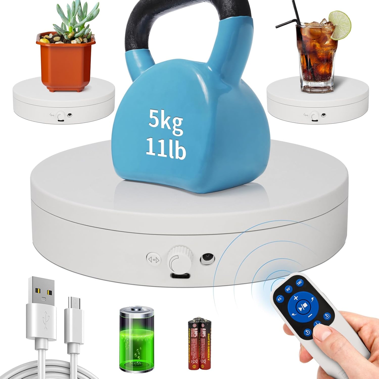 - 【User-Friendly Remote Control】: This user-friendly remote control of motorized rotating display stand offers multiple rotation modes, including continuous rotation, single-step rotation, repeated step rotation, and pendulum (swing) rotation, making it versatile and easy to use for various applications. The knob is used to turn the turntable on/off and adjust the speed. Turning the knob to the right switches it on, and continuing to turn it further increases the photography turntable speed.Remote control adjusts speed, direction, and pause.