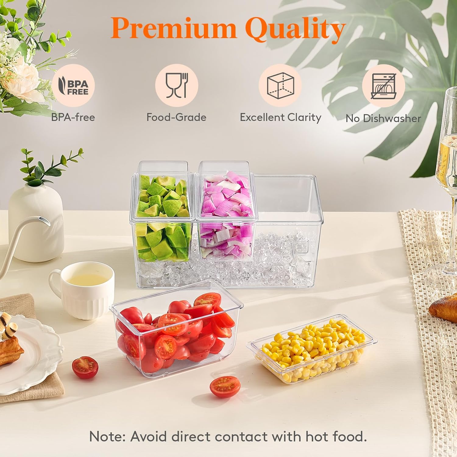 - Preserve Freshness: The lower compartment of the condiment caddy can hold ice cubes or crushed ice to keep vegetables, sauces, or fruits fresh and succulent for hours. Each top compartment has a removable lid for easy food access, preventing flavor contamination and ensuring cleanliness and quality preservation when closed.