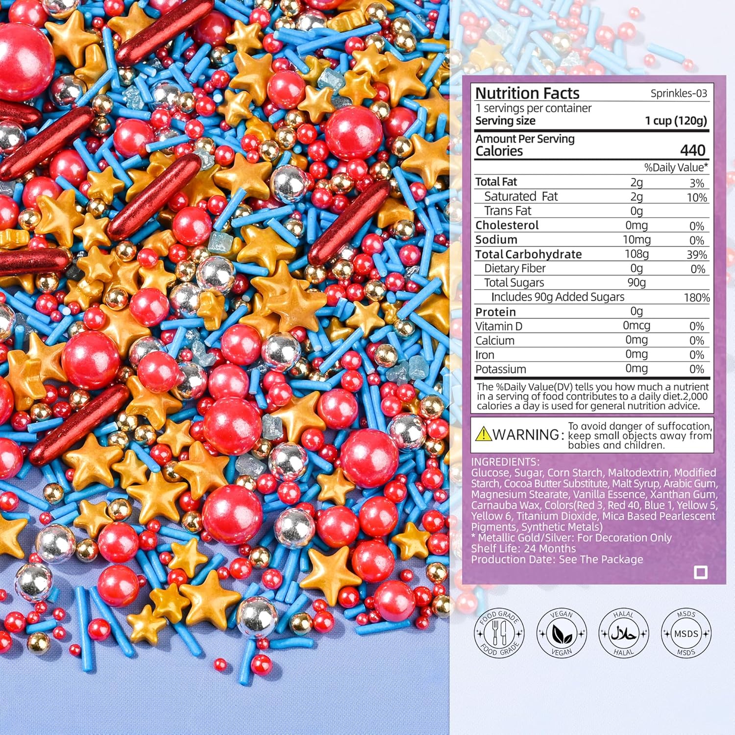 Cobakey Patriotic Sprinkles for Baking, 4th of July Sprinkles With Gold Star, Perfect for Independence Day Dessert Party 4.23 Ounce