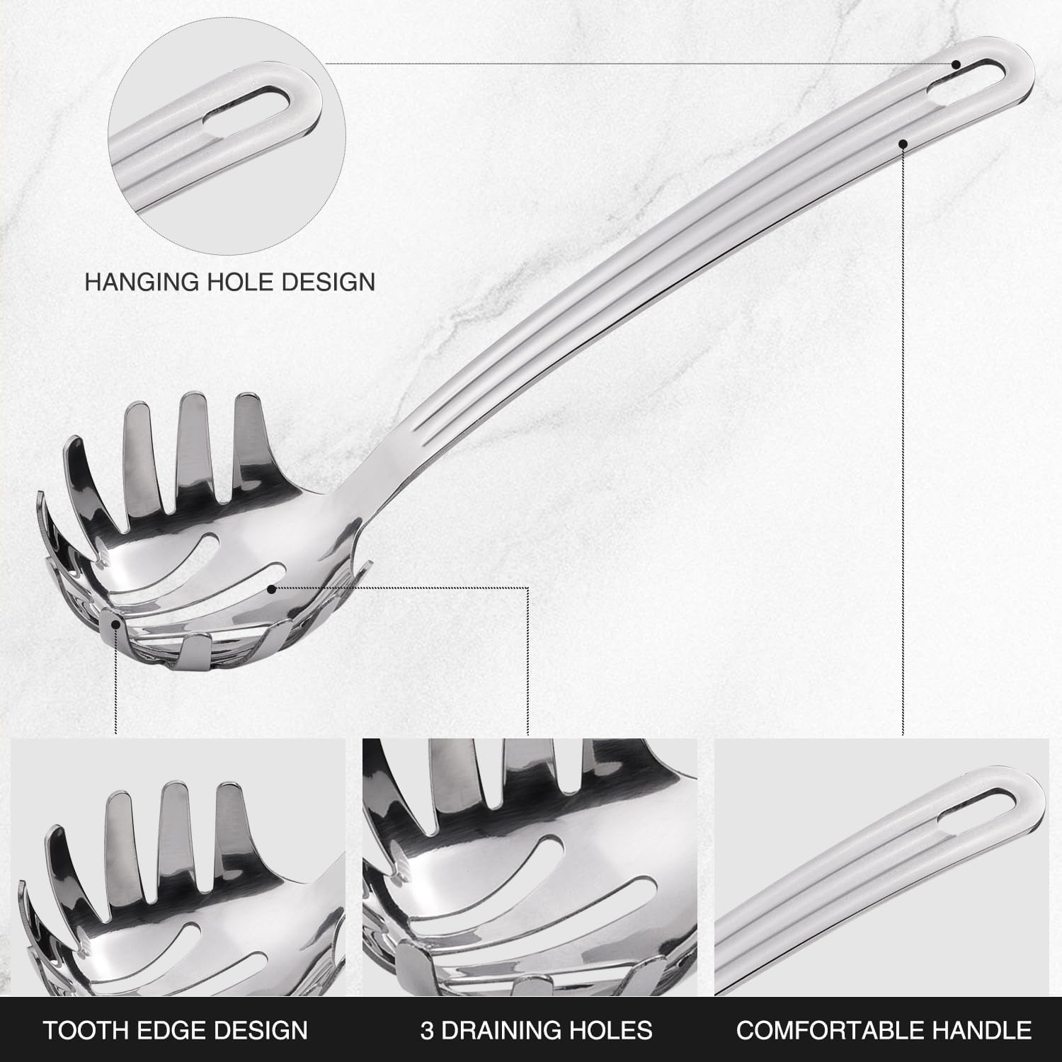 - Material & Durability—Made from stainless steel, this noodle spoon is designed to use for a long time. It is ideal for noodles and pasta dishes. It can help scoop noodles easily.