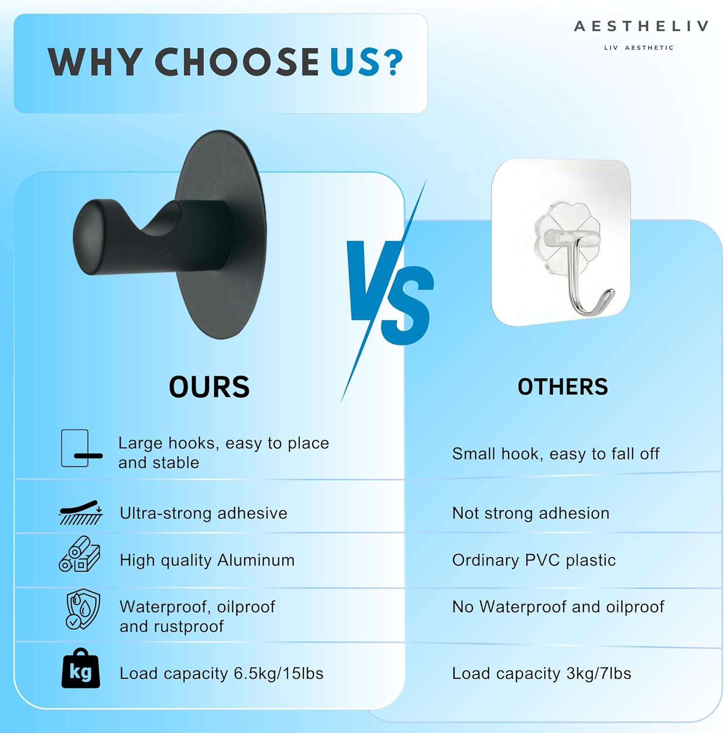 - Waterproof and Rust-Resistant – Perfect for Bathrooms and Kitchens : Built to thrive in high-moisture areas, our adhesive wall hooks are waterproof and rust-resistant, making them the ideal solution for organizing your bathroom, laundry room, or kitchen. Unlike metal hooks that rust over time, our premium black finish remains clean and sleek even in steamy or humid environments.