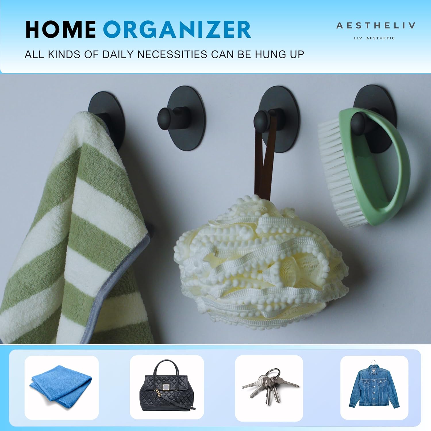 - Multi-Use Wall Hooks – Organize Every Corner of Your Home Our 4-pack of black adhesive wall hooks offers endless organization possibilities throughout your home. In the entryway, keep keys, coats, or dog leashes at arm’s reach. In the bedroom, hang accessories, hats, or bags with ease. In the bathroom, they’re perfect for towels, loofahs, and robes. The kitchen? Ideal for utensils, potholders, and cleaning cloths. Even in the garage, laundry room, or office, these hooks add functional storage without taking up space.