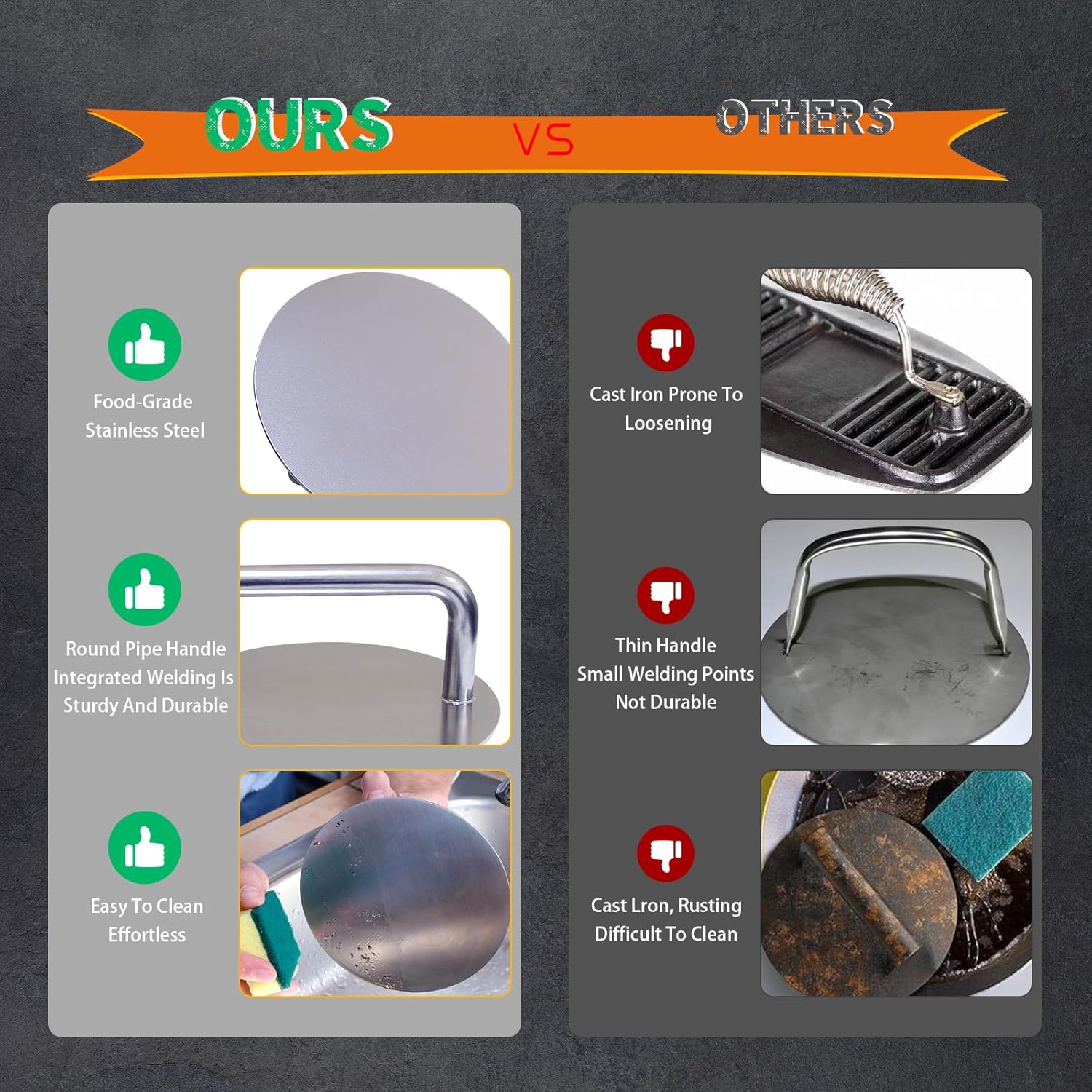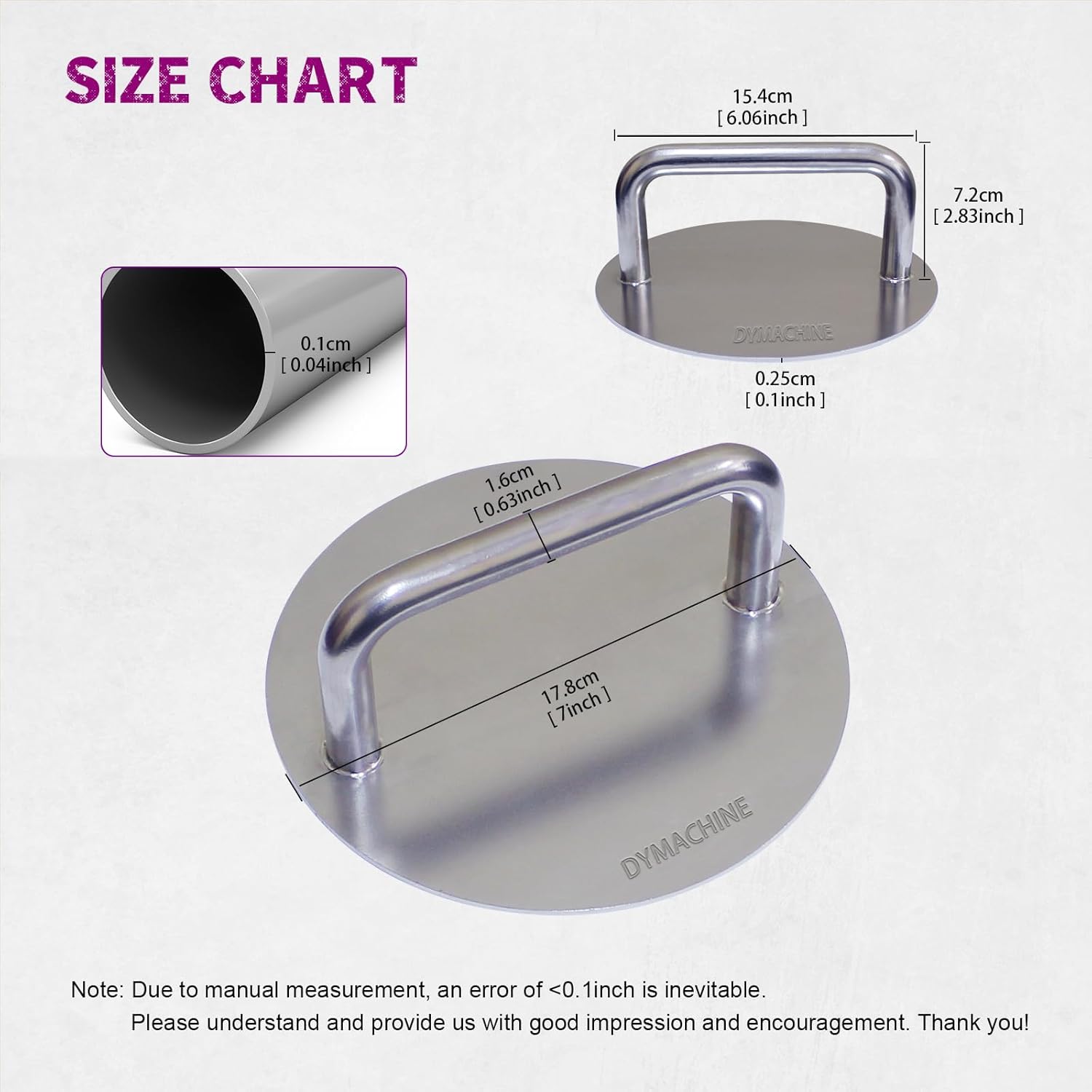 - Specially Designed For Large Meat Patties - DYMACHINE smash burger press made of brushed stainless steel 304 material, integrated bend tube forming, laser welded to the pressure plate in bottom, perfectly combined, extremely sturdy, ensuring worry free cooking time. The diameter of the bent pipe is 20mm, the wall thickness is 1mm, and the thickness of the pressure plate is 2.5mm. The higher thickness makes it easier to shape your meat patty, very practical!
