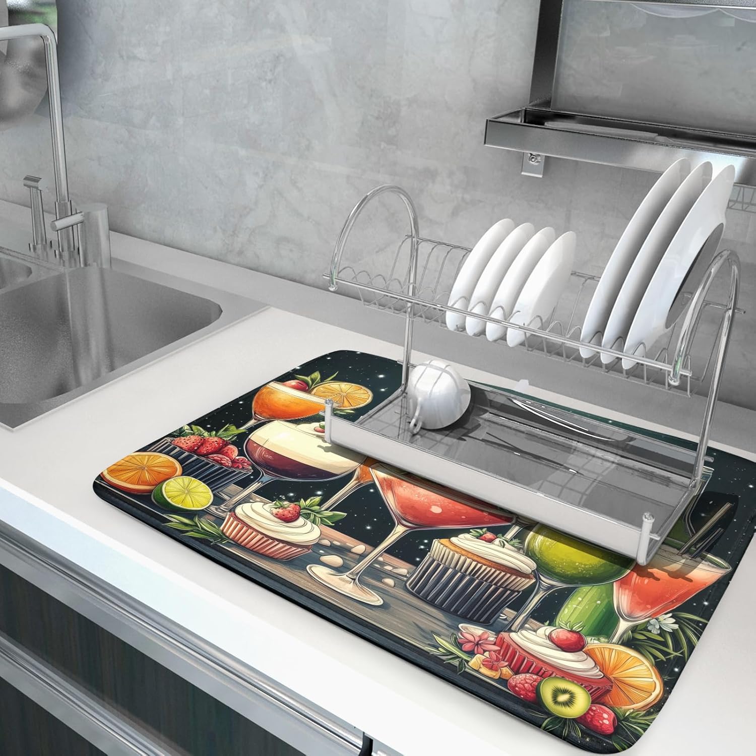 - 3D digital printing technology & attractive design: The juice dish draining mat features vibrant colors and exquisite image. Fun design that is sure to brighten up your day. We kept it simple and elegant to match most theme and colors. Eye-catching print brings more joy to your cooking time