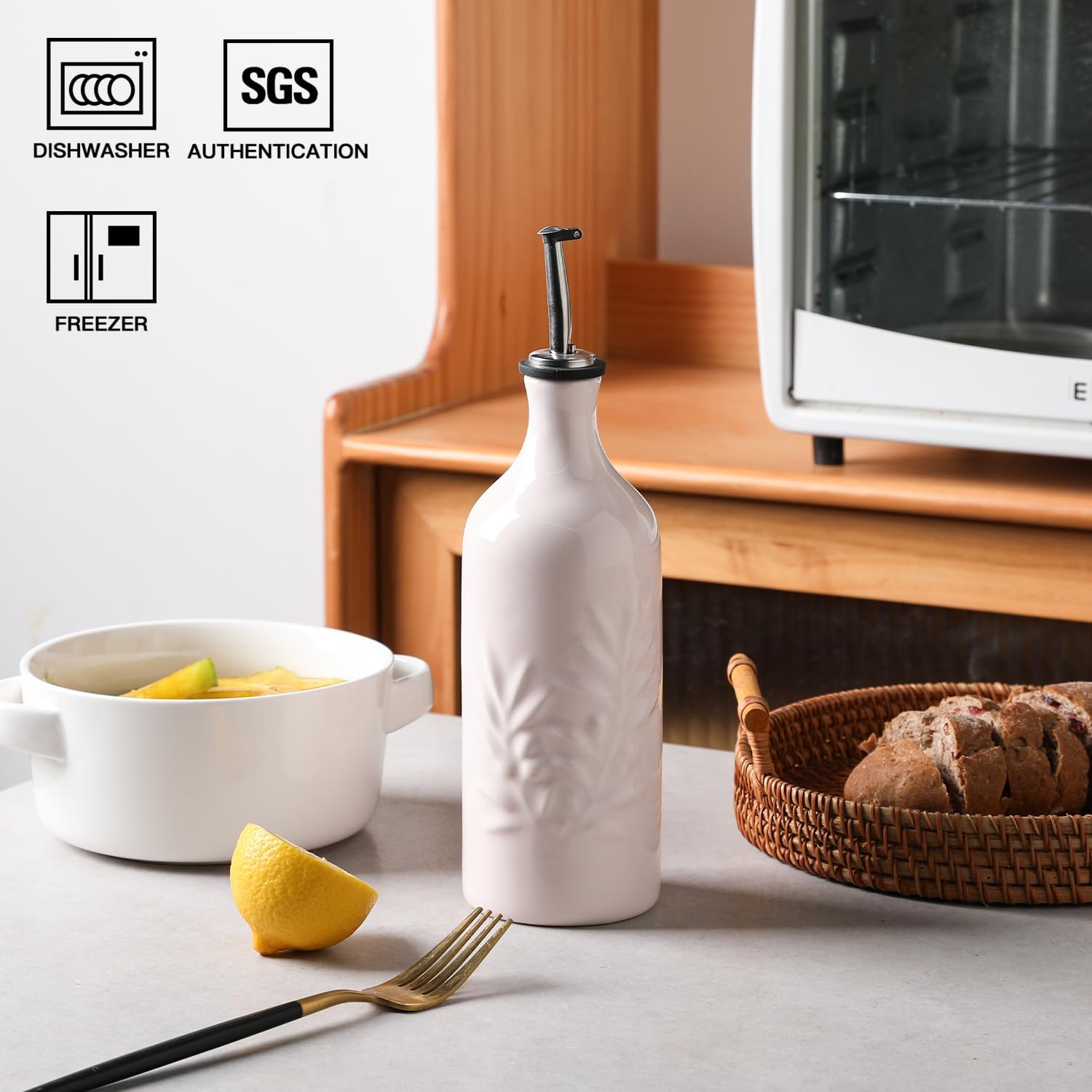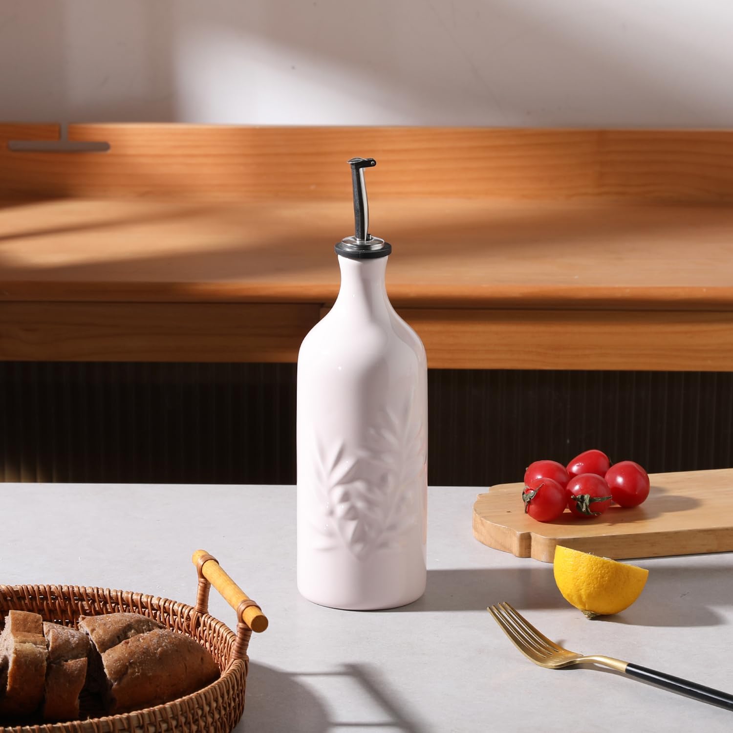 - Modern Relief Design -The bottle body is embossed with olive leaves, which looks elegant and delicate.Precision dumping, bottle body design has a unique spout, can perfectly pour out the oil and vinegar will not leak, the correct control of the use of oil.
