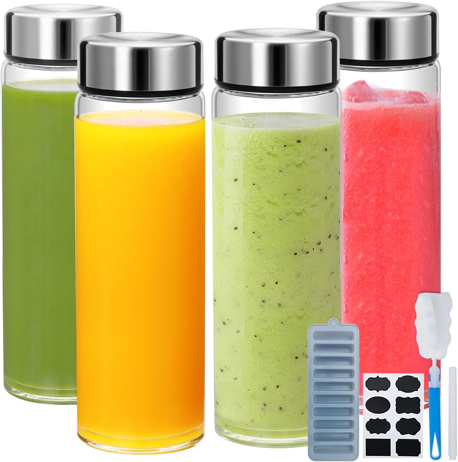 - Product Includes:The glass water bottles includes 4 Pack 500ml (16 oz) high borosilicate glass water bottles with stainless steel lids. In addition, it comes with a long gray silicone ice mold, bottle brush, creative sticker set, and pen.