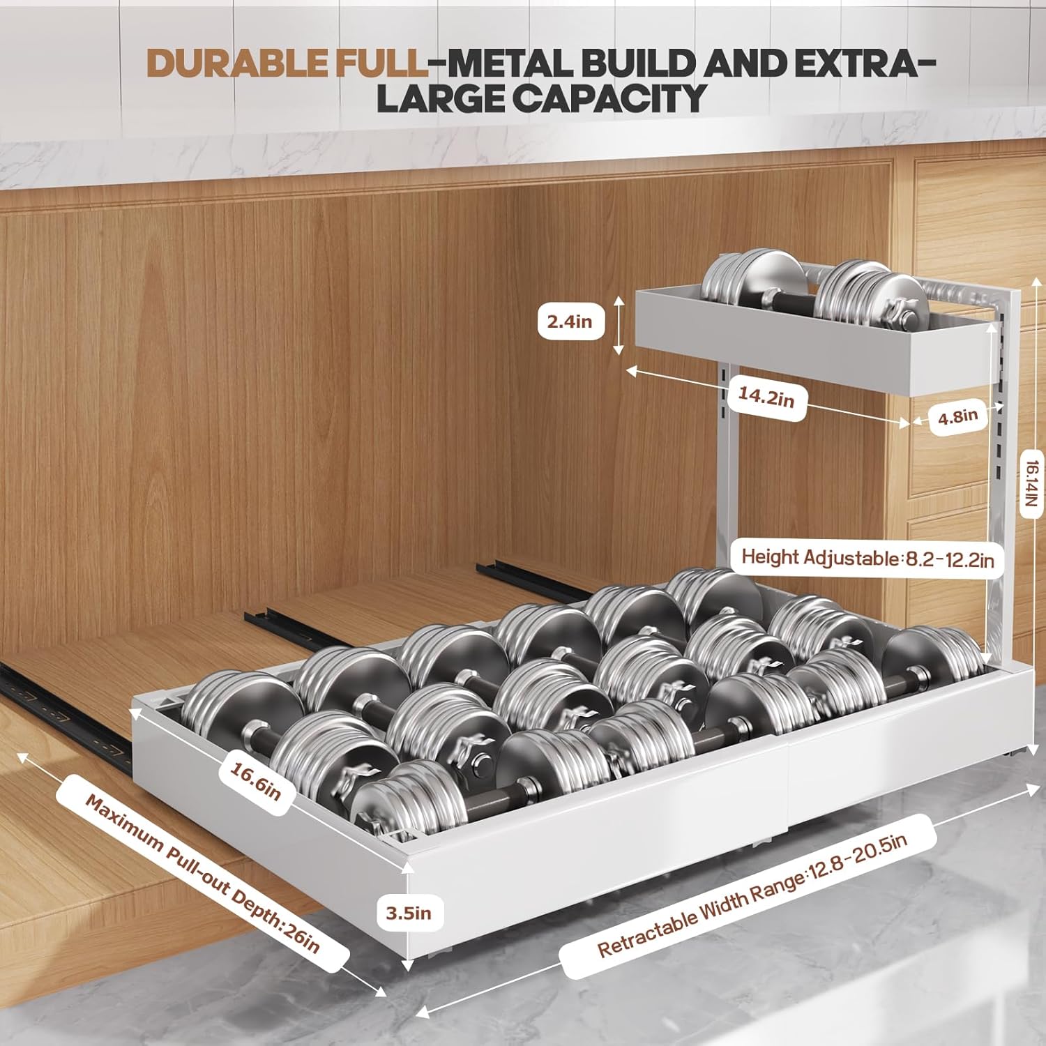 - 【Full-Metal Construction with Rust-Resistant Finish】 Crafted entirely from metal, this under cabnet organizer features a reinforced frame that offers excellent strength and stability. The surface is coated with a rust-resistant finish, which allows it to withstand long-term use in humid environments such as kitchen and bathroom cabinets.