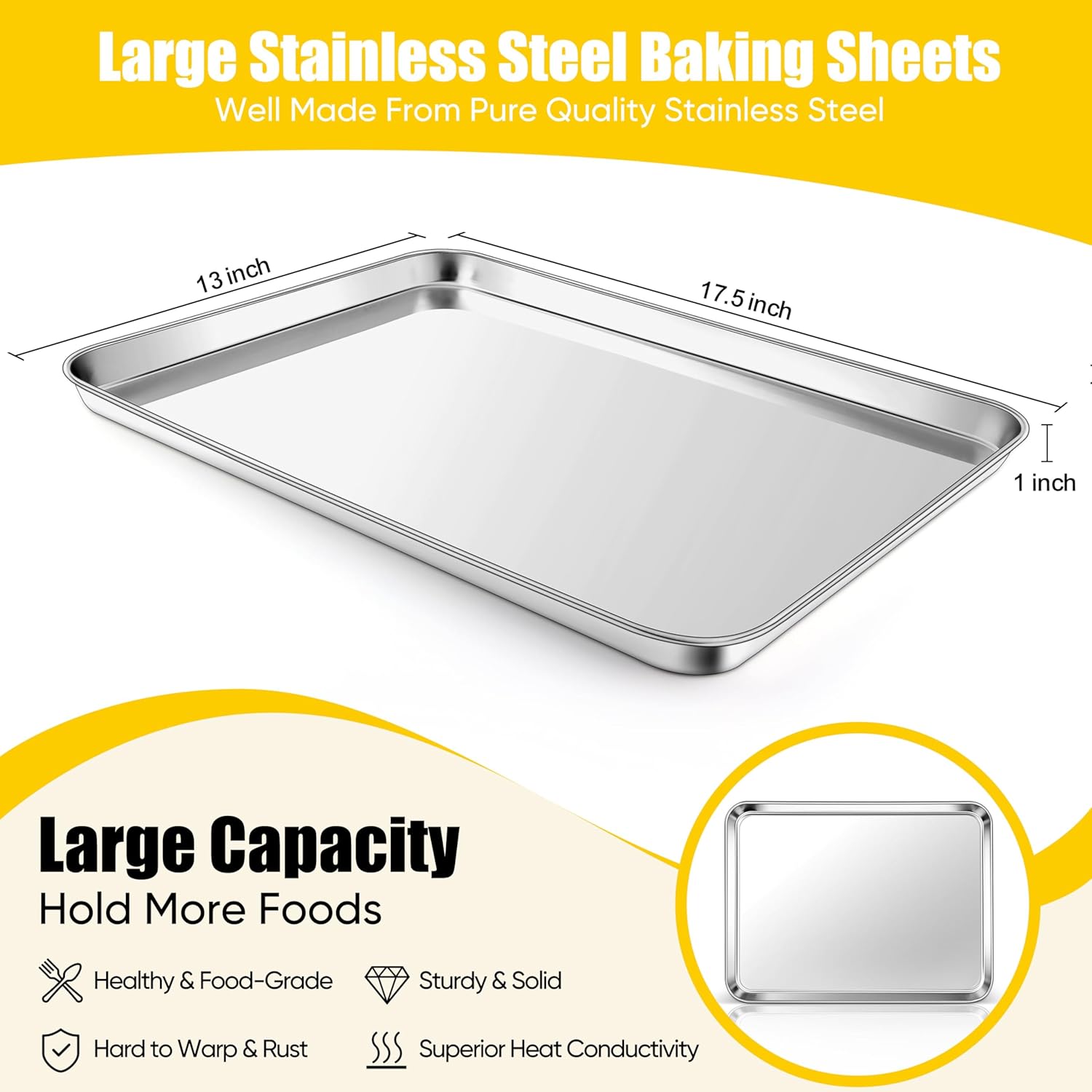 - Nice craft, baking sheet pan featured smooth rimmed edge and round corner for comfortable to hold and easy transfer, 1 inch nice depth sides all around to hold more food and prevent the sauce from spilling and keep your oven neat, stackable design for easy storage to save your kitchen space