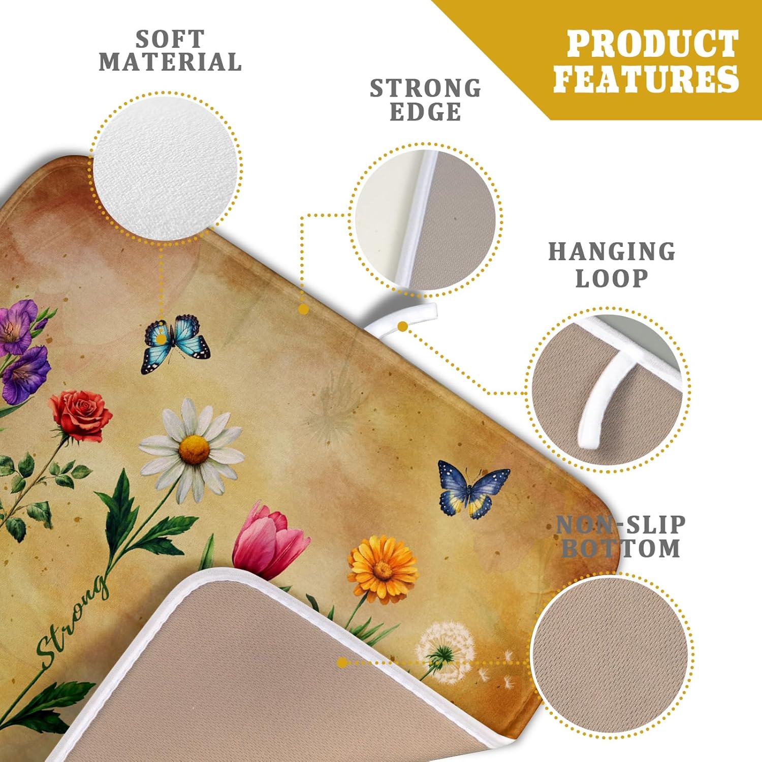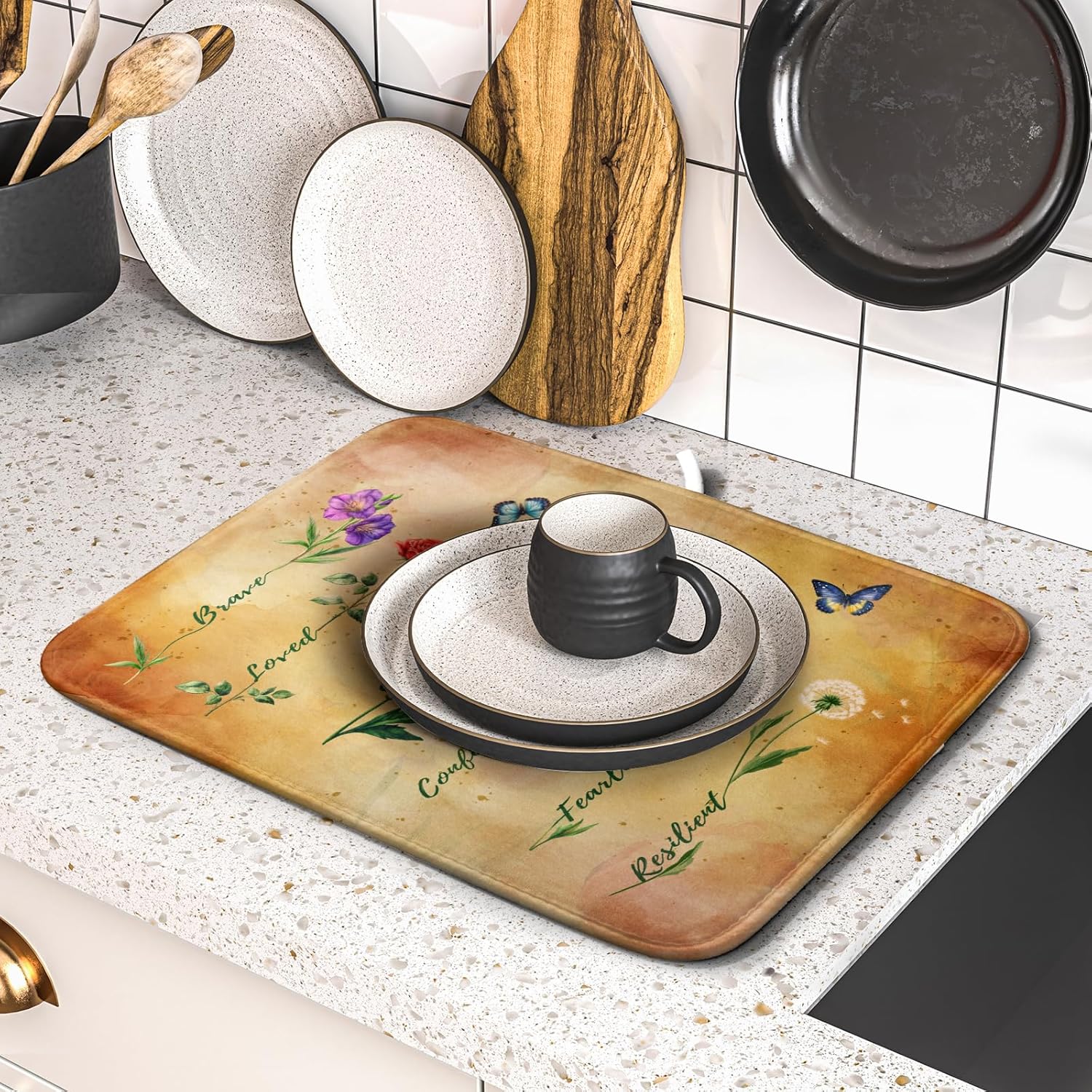 - Material: The wildflowers dish drying pad's surface is made of polyester, with a composite sponge material in the middle, which can quickly absorb water. The butterfly drying kitchen mat protects your counter from scuffs and scratches while also keeping your most prized glassware safe and sound