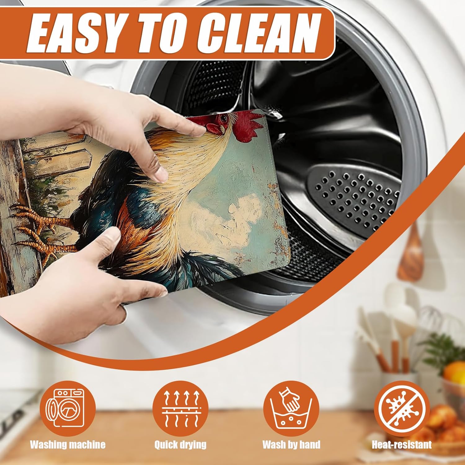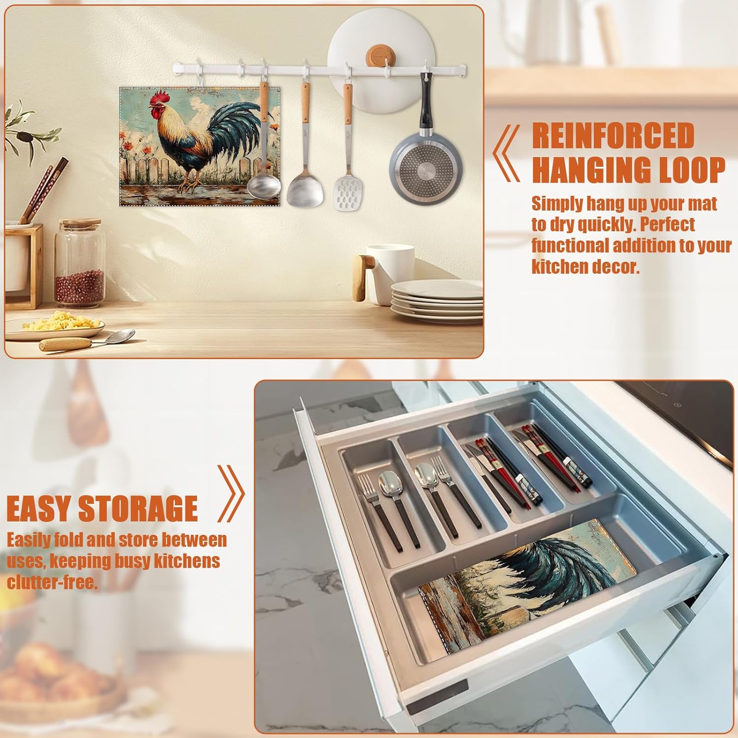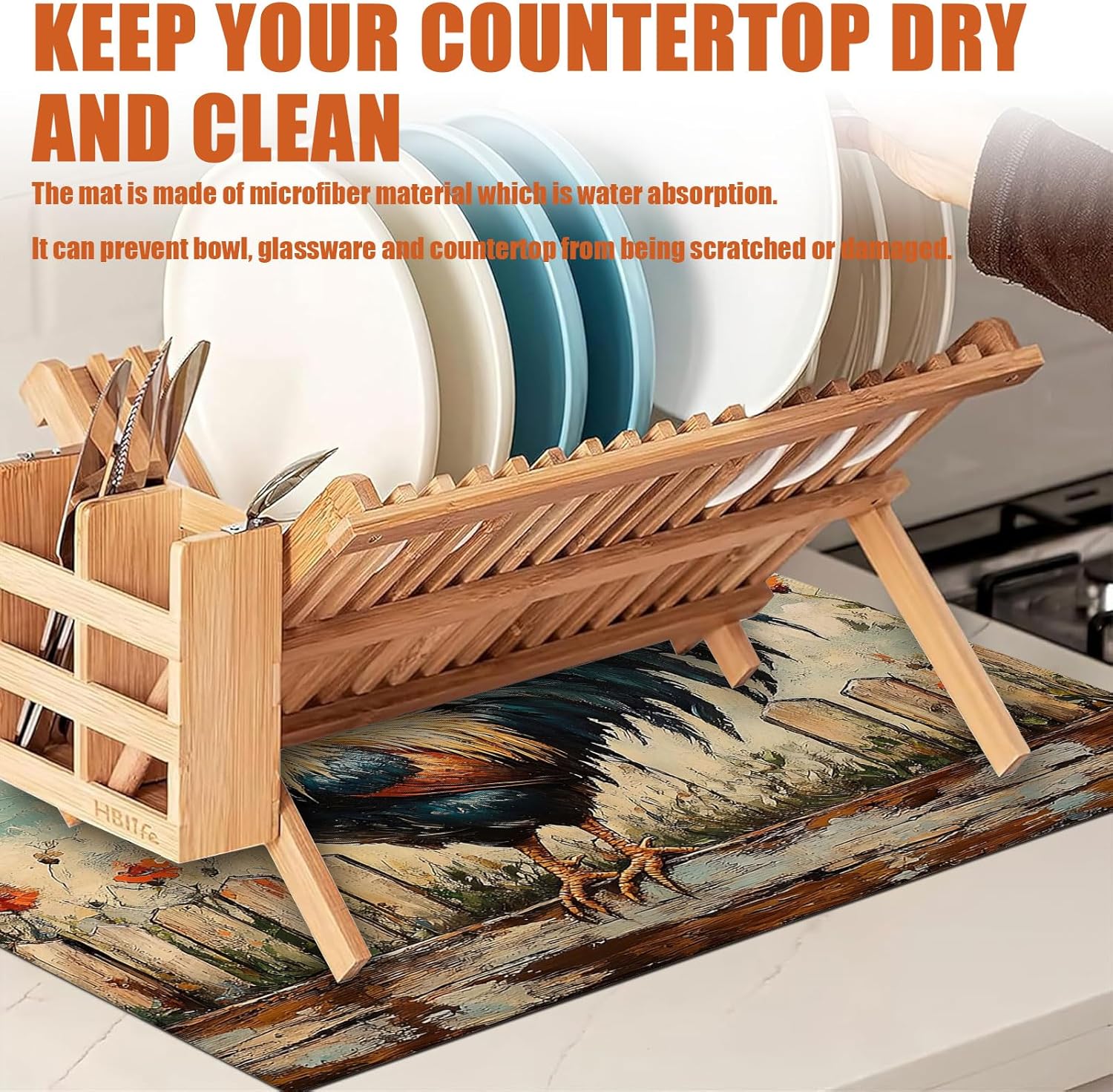 Vintage Rooster Dish Drying Mat for Kitchen Counter Microfiber Absorbent Dish Kitchen Drying Mat Draining Reusable Washable for Dishes/Utensils/Counterto