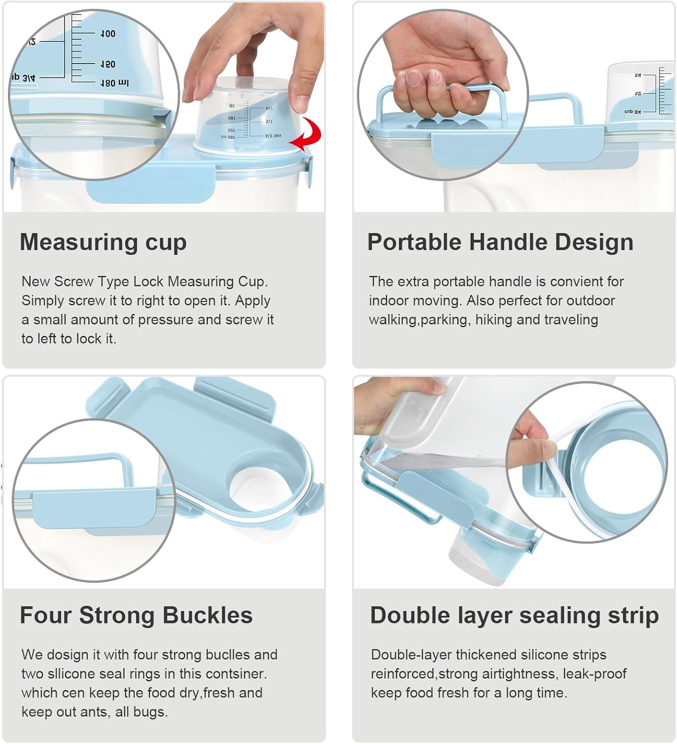 - CLEAR RICE HOLDER:The clear pet food container allows you to identify the contents at a glance,clear visibility and better organization.the cereal dispenser will keep your kitchen pantry neat and organized.there is also a portable handle for easy movement and going out