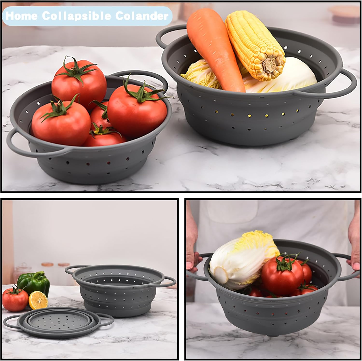 Collapsible Colander with Handle, Silicone Kitchen Colander for Easy Storage,Four-side Fast Draining Silicone Draining Basket, Perfect for Fruits Vegetables (Gray L)