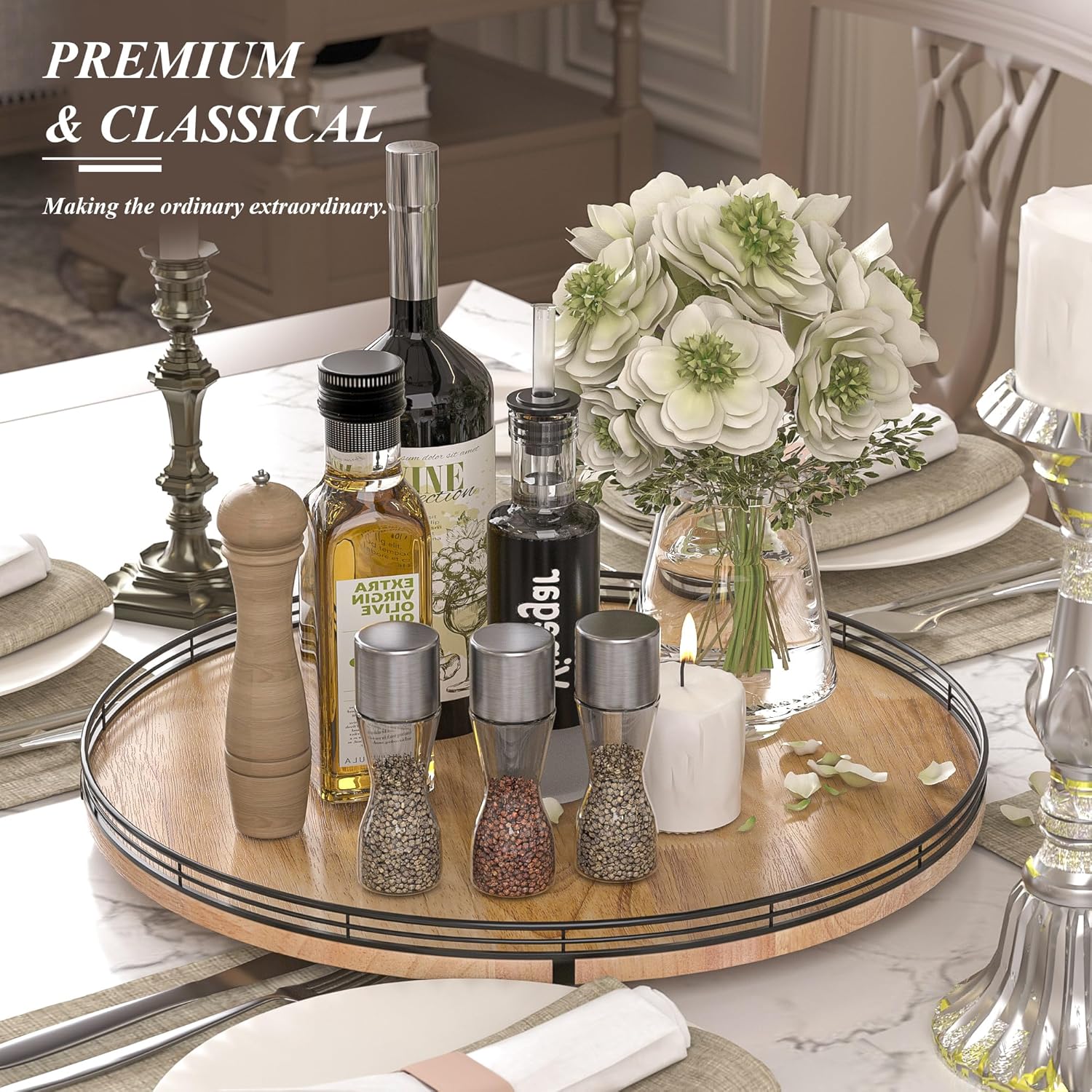 - PREMIUM MATERIAL: Our farmhouse lazy Susan organizer is made of natural solid oak wood and strong metal, sturdy, durable and premium quality. This wooden turntable organizer is a game-changer for keeping your kitchen organized. The farmhouse oak finish gives it a rustic, charming look that will fit perfectly with your kitchen decor.