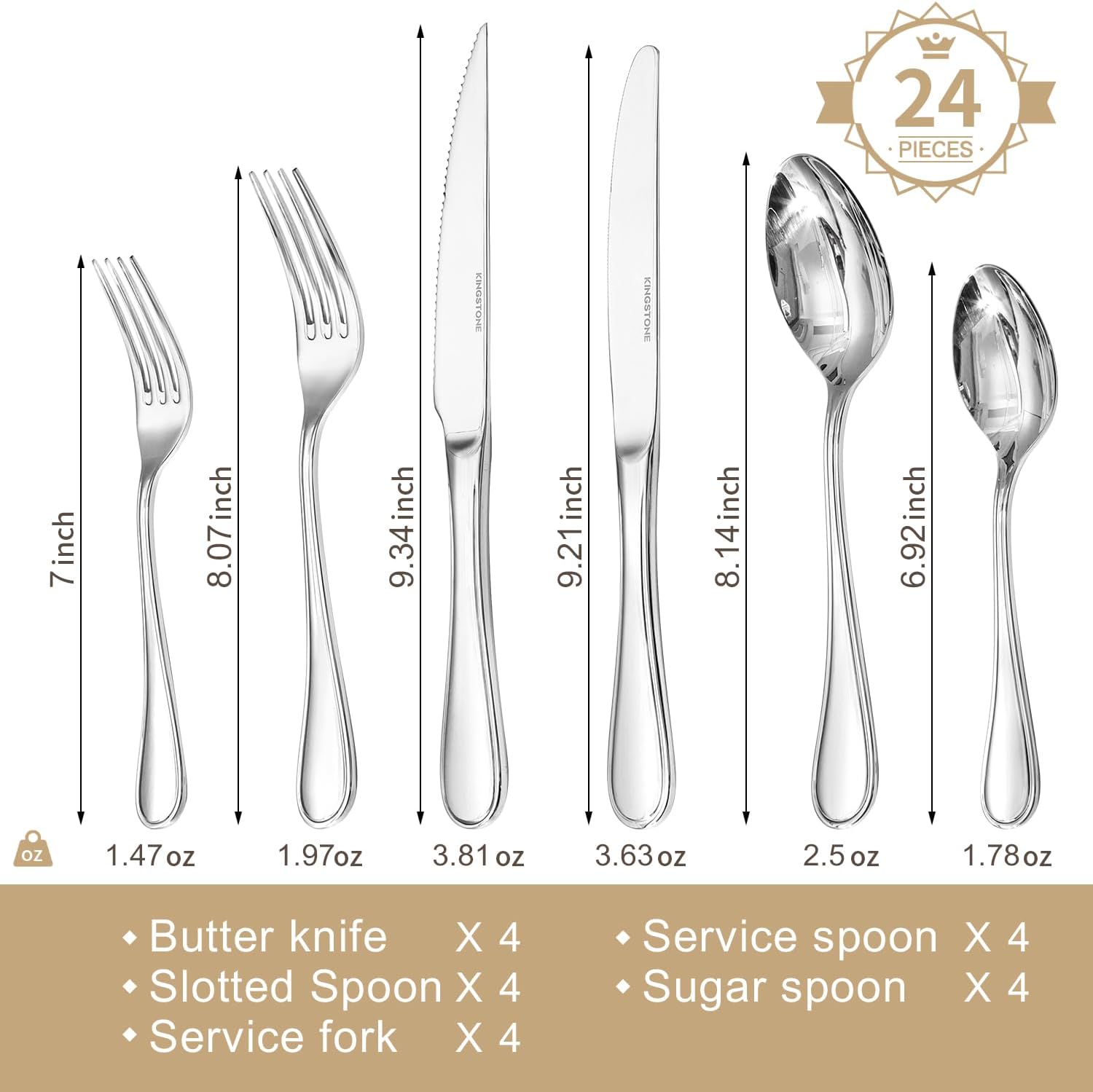 - Silverware set for 4: 24-piece silverware set includes 4 dinner forks, 4 salad forks, 4 dinner knives, 4 dinner spoonsand, 4 teaspoons and 4 steak knives, which can be used for 4 people. Suitable for different occasions, whether it is daily use like family dinners or formal occasions like wedding, banquet, this flatware set is an ideal choice.