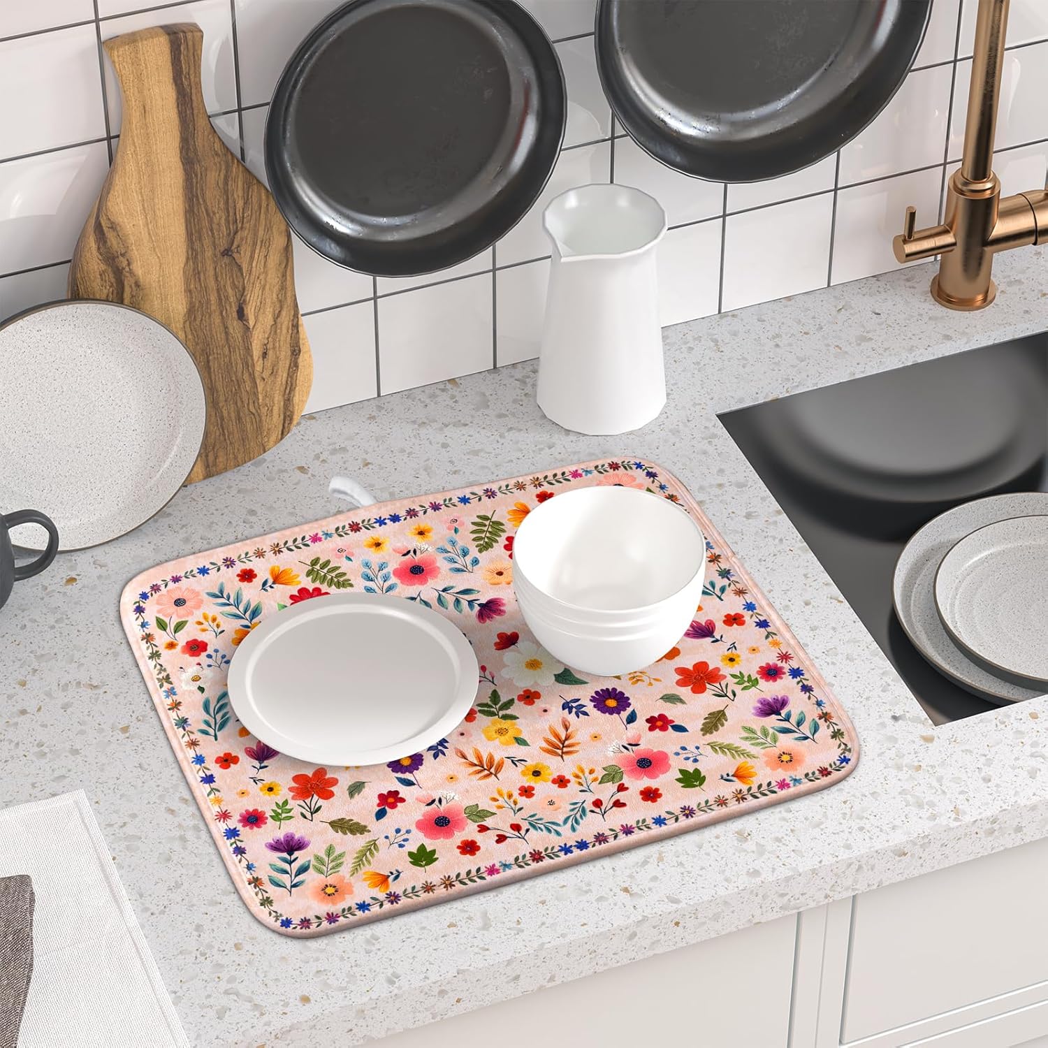 Boho Floral Dish Drying Mat - Pink Wildflower Absorbent Microfiber Kitchen Counter Pad for Home Coffee Bar Decor