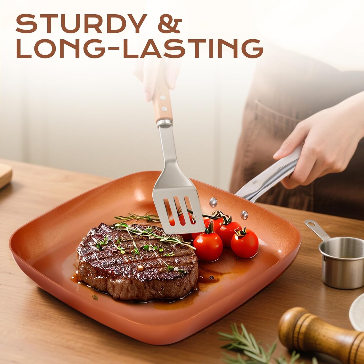 Non-Stick Copper Square Frying Pan, 12" Chef Skillet with Ceramic Coating, Oven Dishwasher Safe, PFOA-Free, Home Use for All Stoves