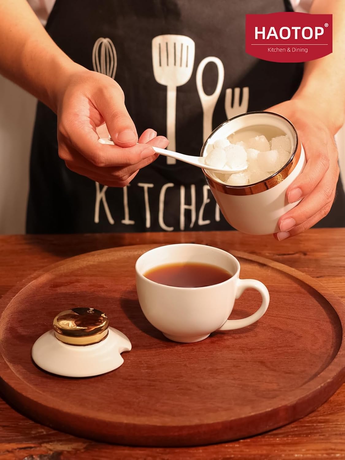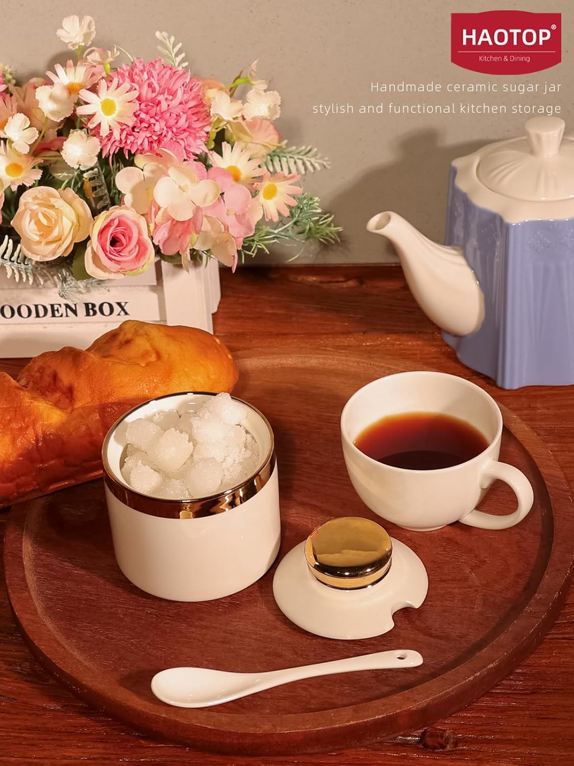 HAOTOP 8 oz Sugar Bowl with Lid and Spoon, Simple Ceramic Sugar Jar Sugar Dispenser Sugar Container Coffee Bar Accessories, Modern Kitchen Countertop Canisters, White