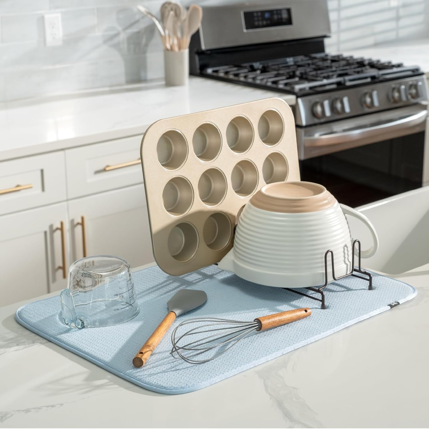 - Dish drying mat for kitchen counter protects surfaces from scratches and scuffs when placed under kitchen gadgets; multipurpose drying pads can be used as an appliance slider for a mixer or blender