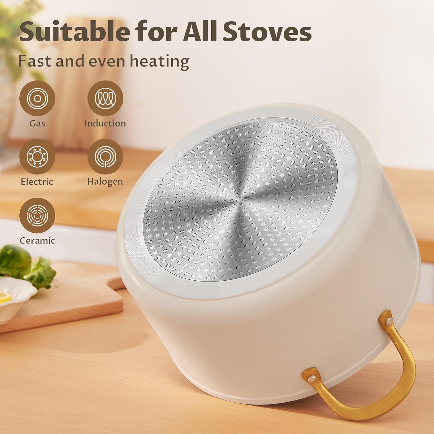 BEZIA 6 Quart Stock Pot with Lid,Ceramic Nonstick Cooking Pot,Soup Pot with Stainless Steel Handle, Tempered Glass Lid, Induction Compatible for Pasta, Soup, Spaghetti,Dishwasher Safe, Cream