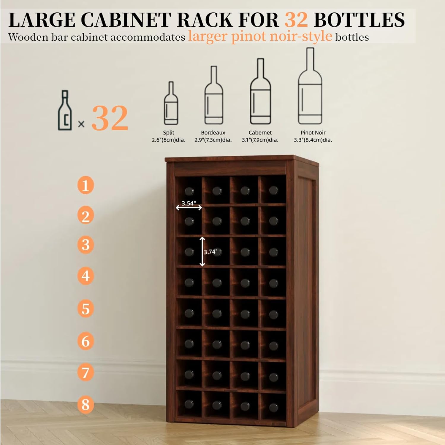 - Easy to match - Slots Size: 3.54"W × 3.78"H× 15"D is suitable for most wine specifications on the market. Same series of small wine cabinet and wine rack with glass holders are on the way. You can be DIYed freely.
