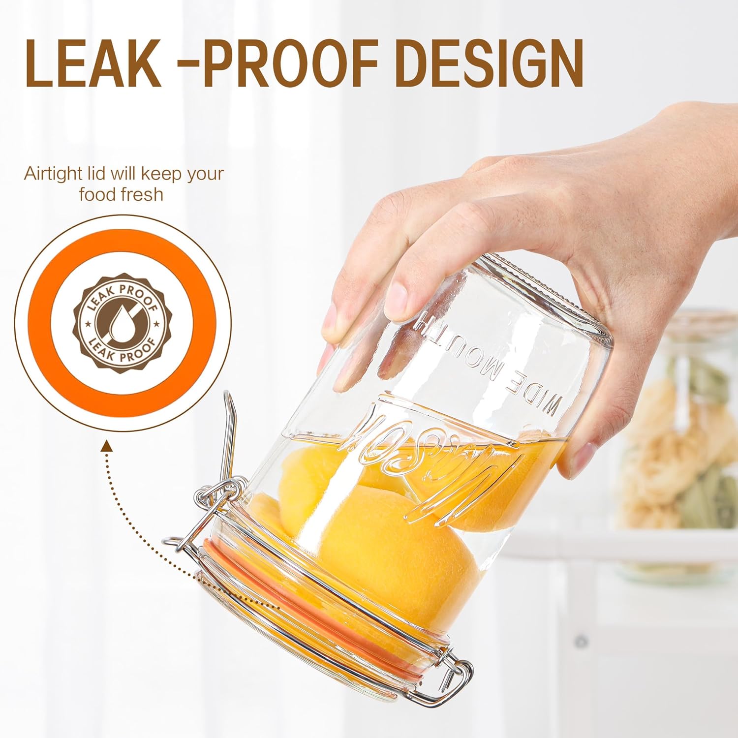 - 【Airtight & Leak-Proof for Maximum Freshness】Each 24oz Mason jar features a secure hinged lid with a rubber gasket, creating an airtight, leak-proof seal to keep food fresh and prevent spills. Perfect for preserving jams, pickling vegetables, and storing dry goods like spices, herbs, and coffee beans
