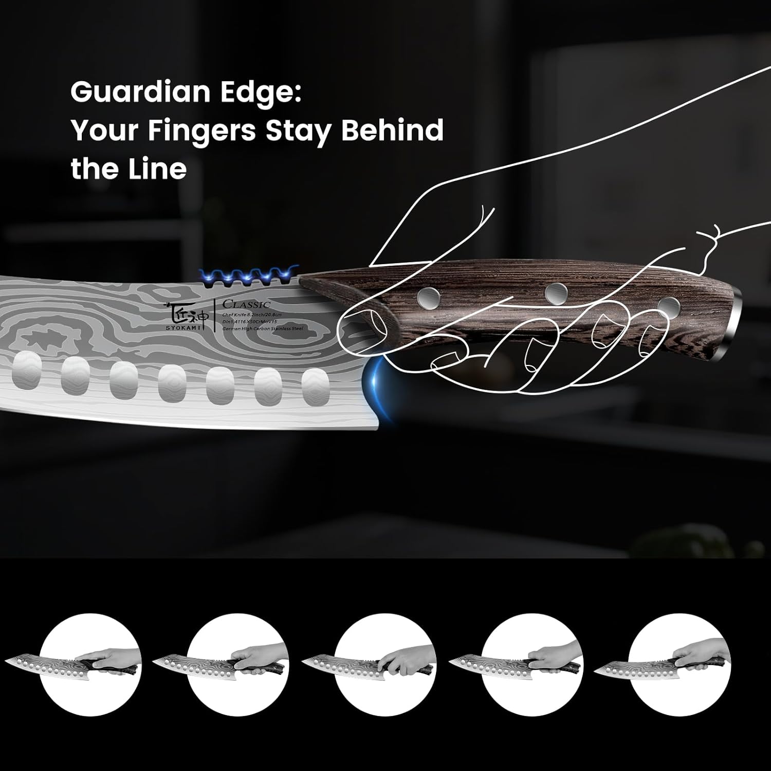- NON-SLIP CONSIDERATION—We have added a contemporary gear teeth element to this kitchen knife. Combined with the absorbent wenge wood handle, it ensures a stable grip even when the hand or handle is wet, allowing for ease of operation and a sense of security even in a busy kitchen