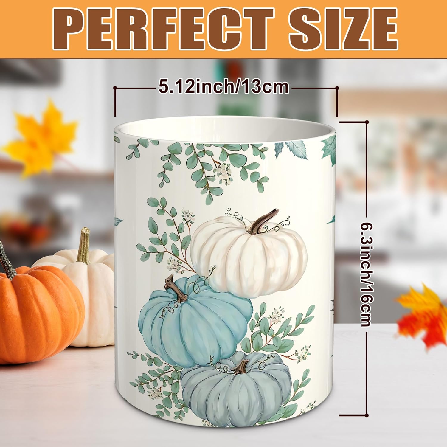 - FALL KITCHEN DECOR: This fall utensil holder brings the fall charm to your kitchen, featuring iconic autumn motifs—eucalyptus blue pumpkin and maple leaves. Whether it's for everyday use or a fall holiday party, it will be the center of attention and have your guests raving about it