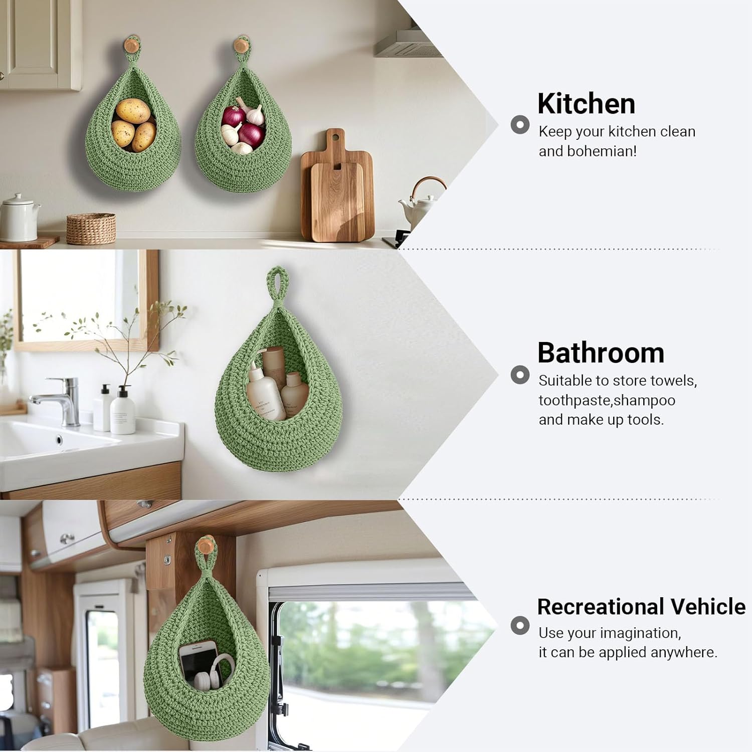 Hanging Fruit Baskets for Kitchen, 3 Pack Boho Cotton Rope Handwoven Vegetable Storage Wall Mounted Large Organizing Basket for Farmhouse Decor, Onion, Potato, Garlic and Plants (Green)